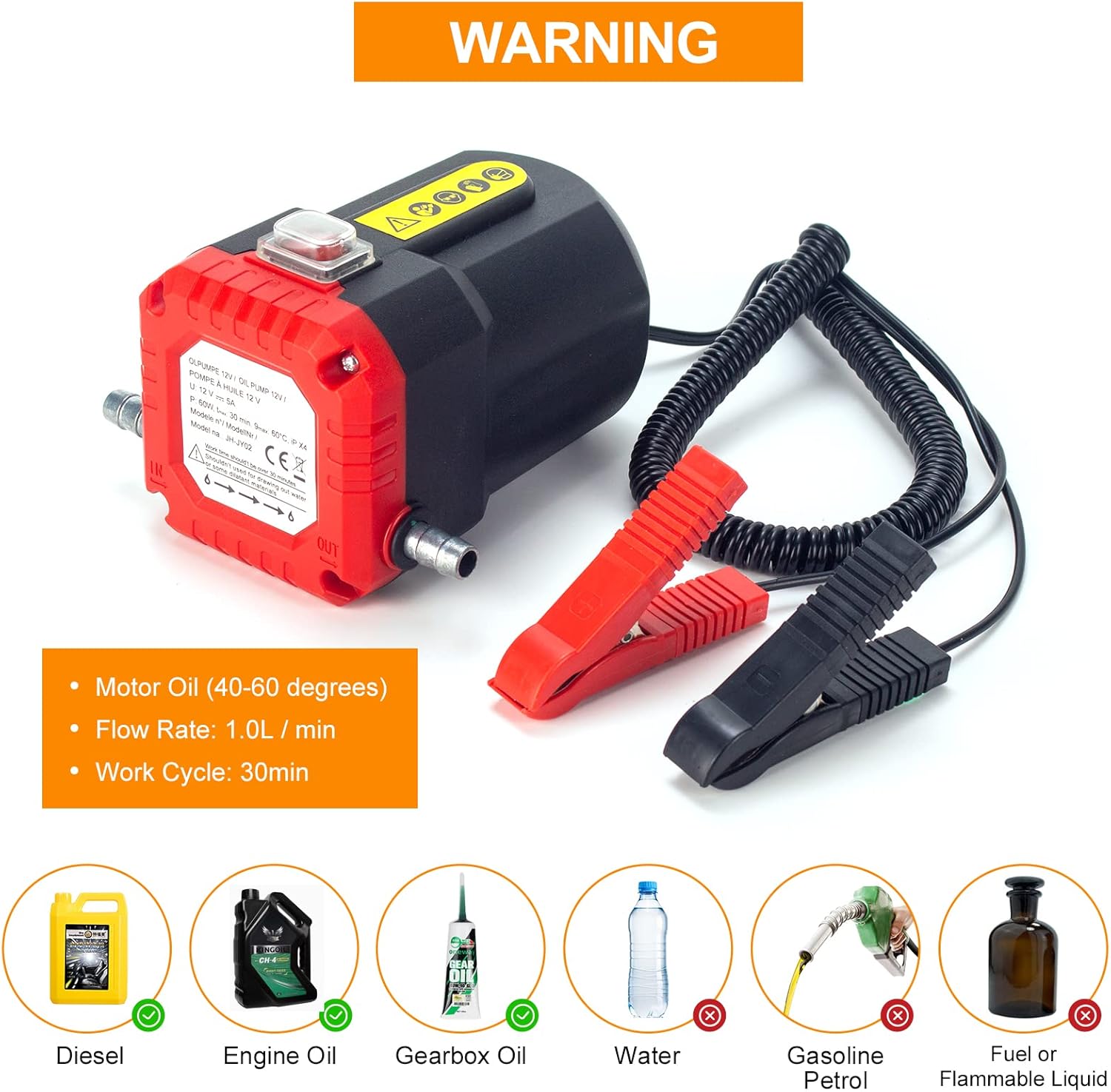 - 【Diesel Fluid Extractor Pump-WARNING】Only used to pump diesel and used engine oil.DO NOT use the product to pump fuel, petrol,water,paraffin or other easily en-flammable liquids,danger of explosion!