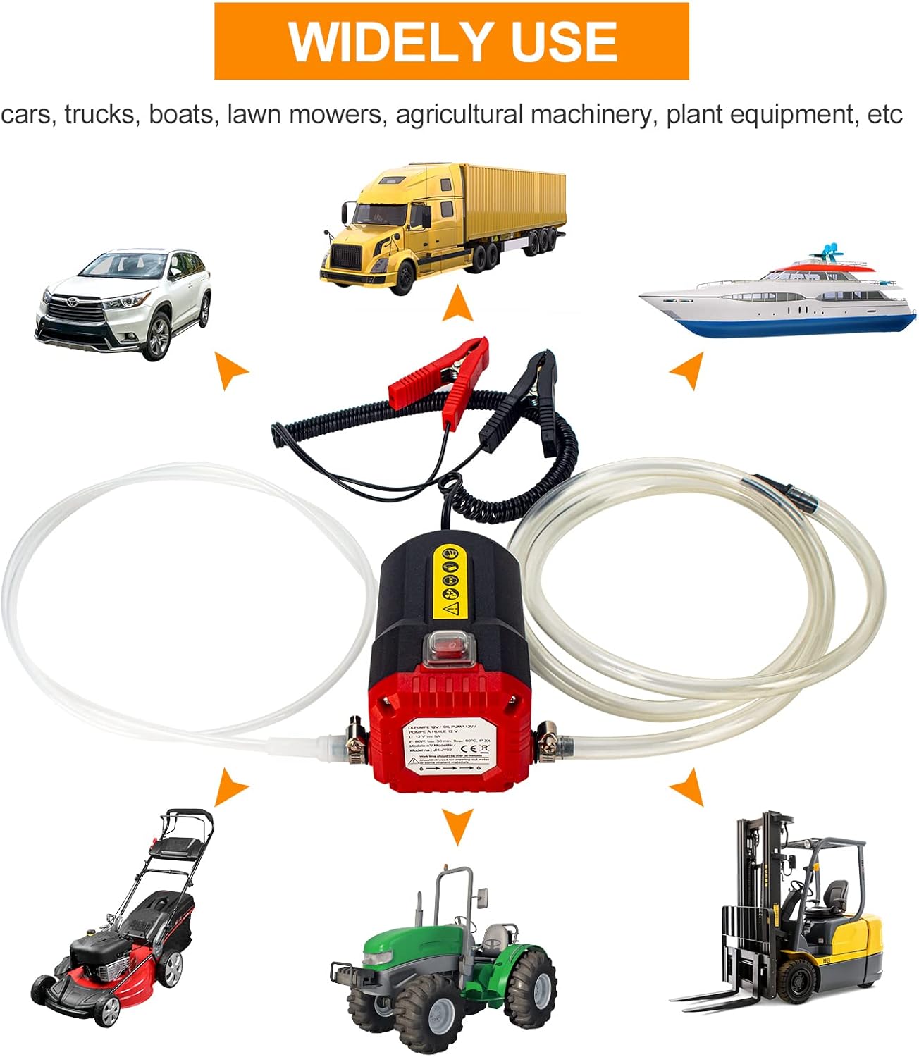 - 【Oil Suction Pump with Tubes-Widely Use】Oil transfer pump can change engine oil and diesel for cars, boats, motorbikes, trucks, RV and ATV, enerator, Tractor, Riding Mower, Snowmower, Farm Machineryand other 12V vehicles.