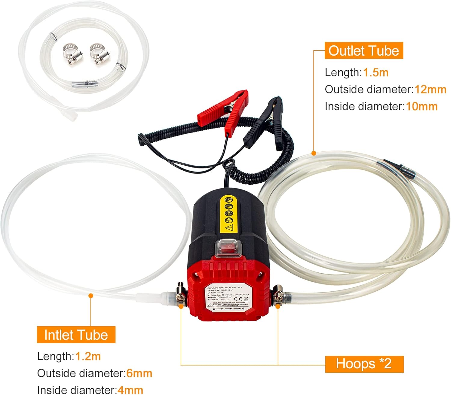 - 【Package Included】 1 x Oil Extraction Pump; 1 x Outlet Hose; 1 x Inlet Hose; 2 x Hose Clamps; 2 x Battery Clamps