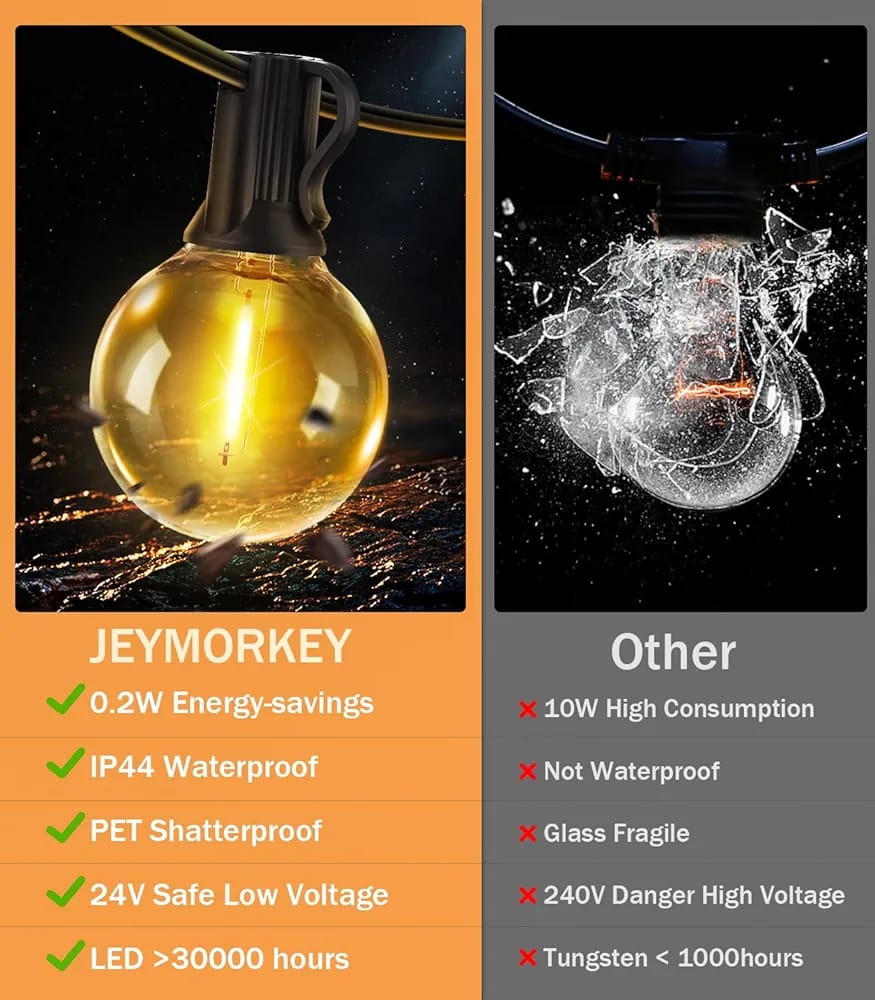 【24V Safe Low Volatge and Connectable】Outdoor lights mains powered with 30 bulbs and 2 spare bulbs. Our outdoor light is 24V low voltage within a human safety voltage range, and come with a CE and UKCA certified UK plug, make sure the outdoor string lights is safe and reliable. G40 bulb can save you 95% of electricity bills. All bulbs work independently, even if a single bulb fails, the entire string continues to work, just replace it with a spare bulb.In order to meet the perfect length you need, globe outside lights is connectable