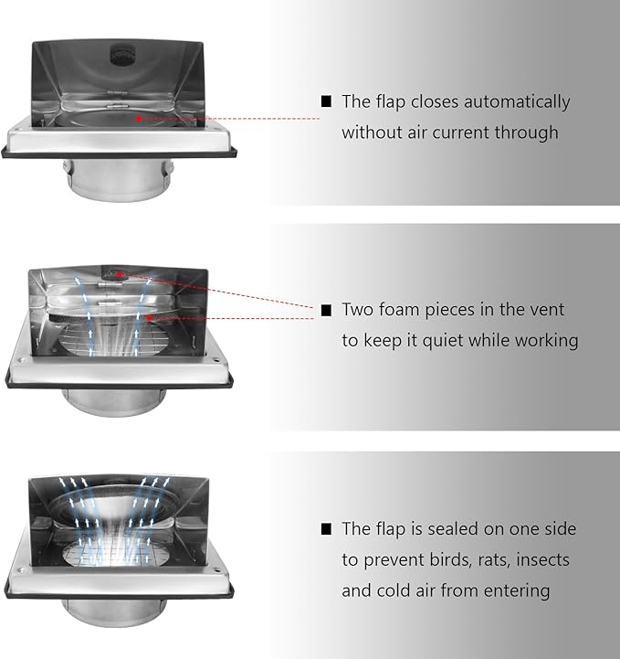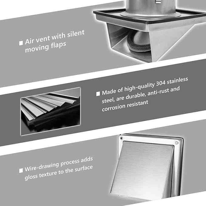 • Premium Material: The dryer vent cover is made of brushed 304 thick stainless steel material that is durable, sturdy, resistant to rust and corrosion. It adopts advanced stamping and polishing technology and can withstand harsh weather conditions