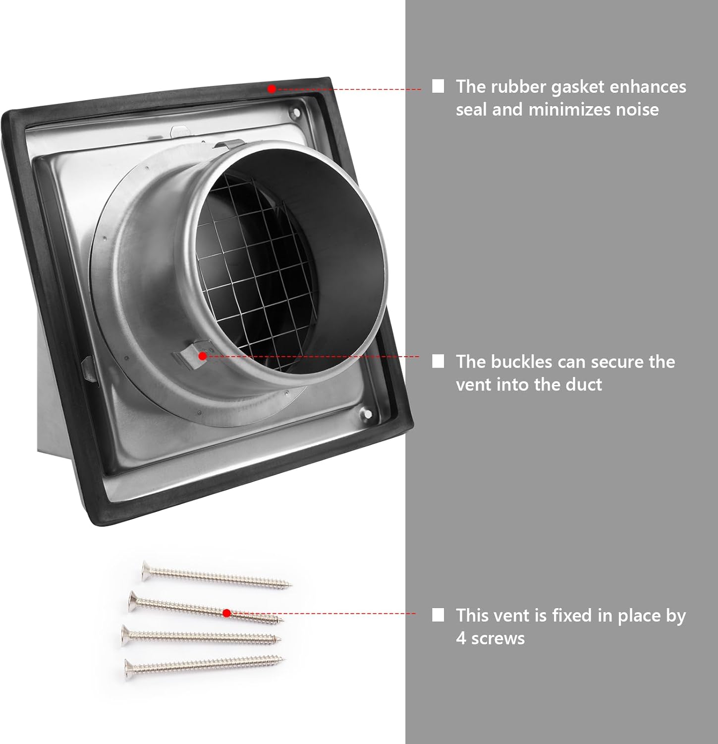 • Easy Installation: This dryer vent cover can be easily installed indoors or outdoors, available for wall or ceiling mounting. Dryer exhaust vent is fixed in place with 4 screws. The included rubber gasket minimizes noise