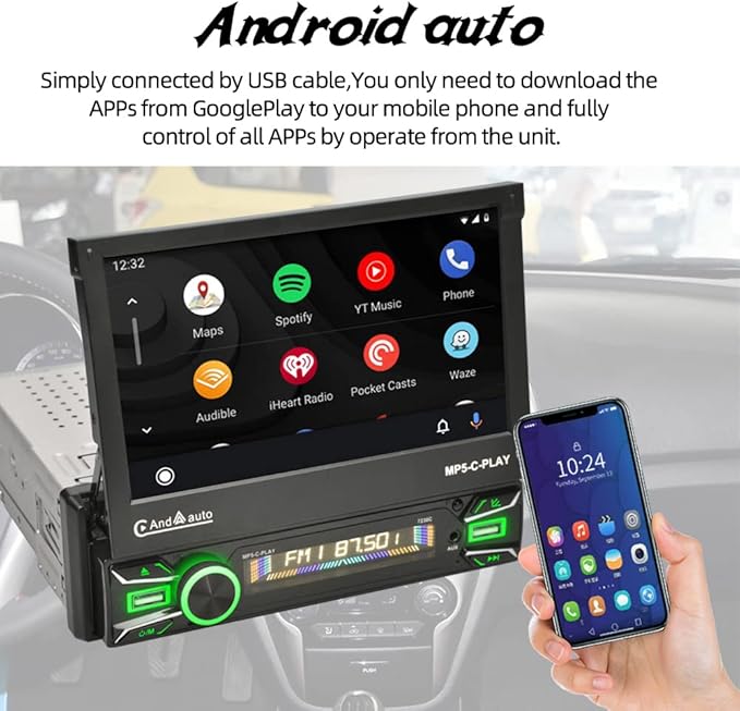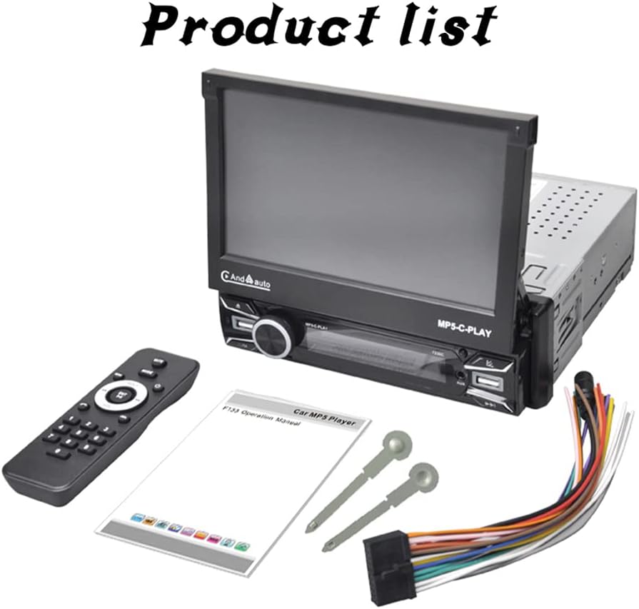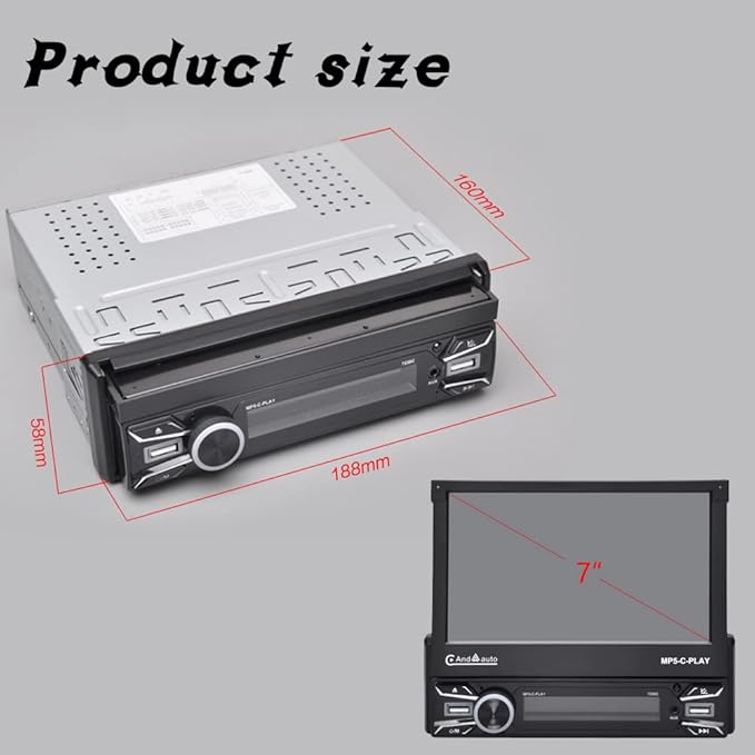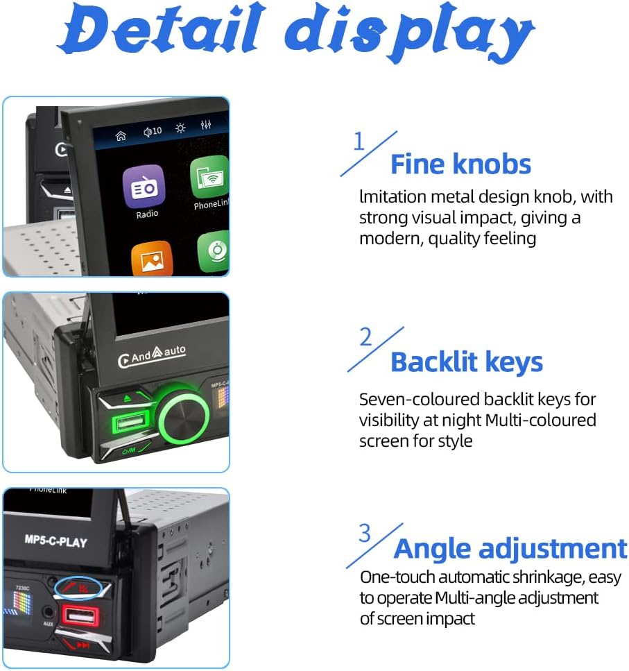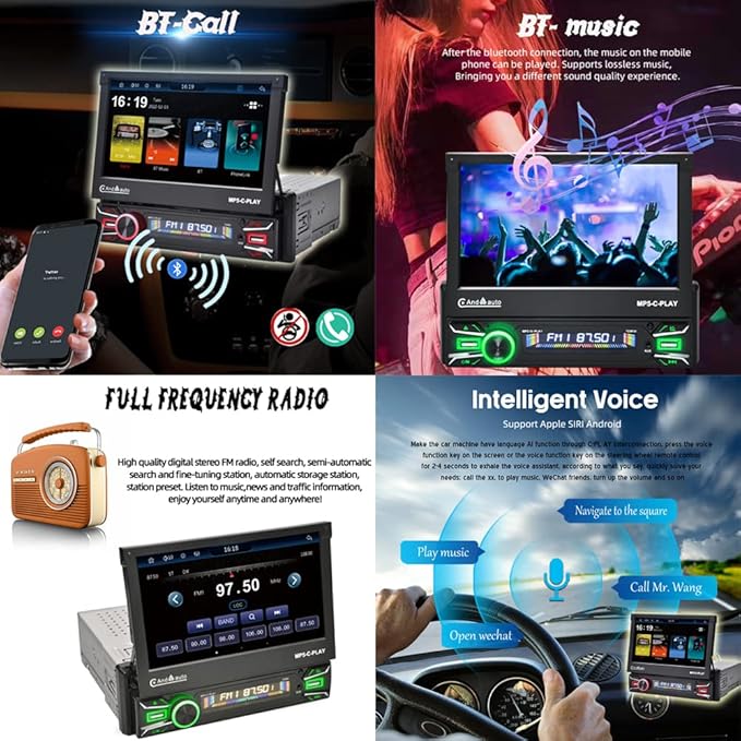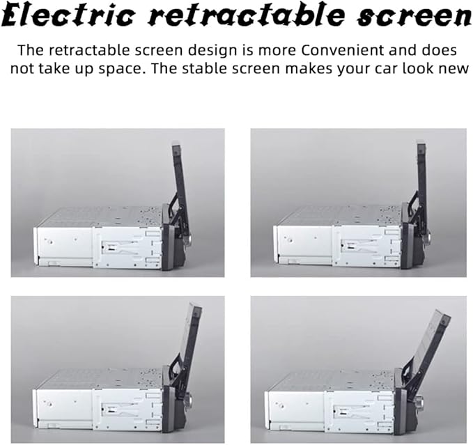 • Automatic retractable folding screen: The car player connects a 7-inch automatically retractable HD touchscreen panel to a standard single DIN stereo. It can be switched between 2 modes: one as a traditional single-DIN car stereo and the other as a smart touchscreen car radio. You can easily open/fold the radio screen with the press of a button.
