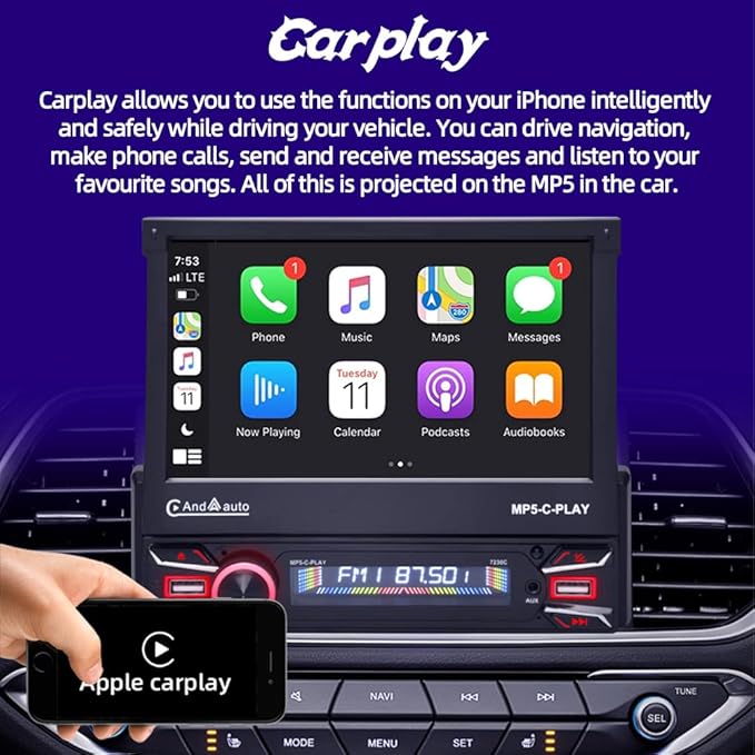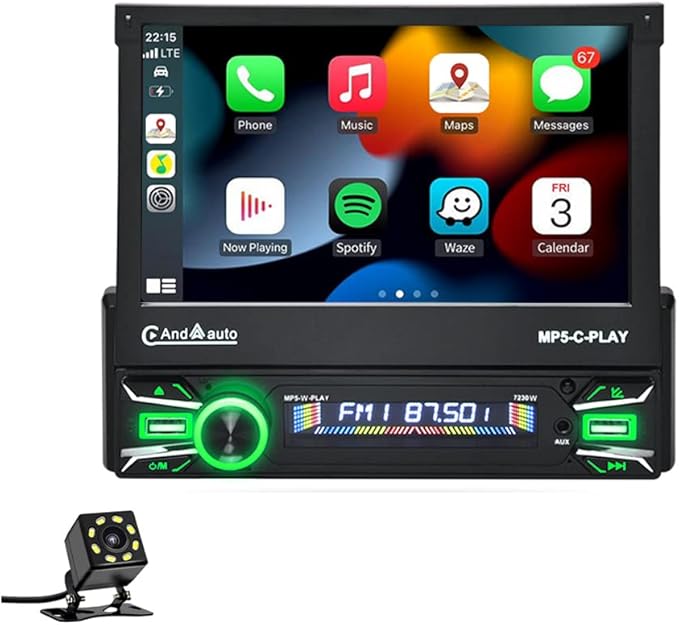 Wireless CarPlayer Android Auto Car Stereo 7 Inch Automatic Retractable Touchscreen 1 Din Car Radio Bluetooth Support FM USB AUX IN Mirror Link Smart Audio + 8LED Camera
