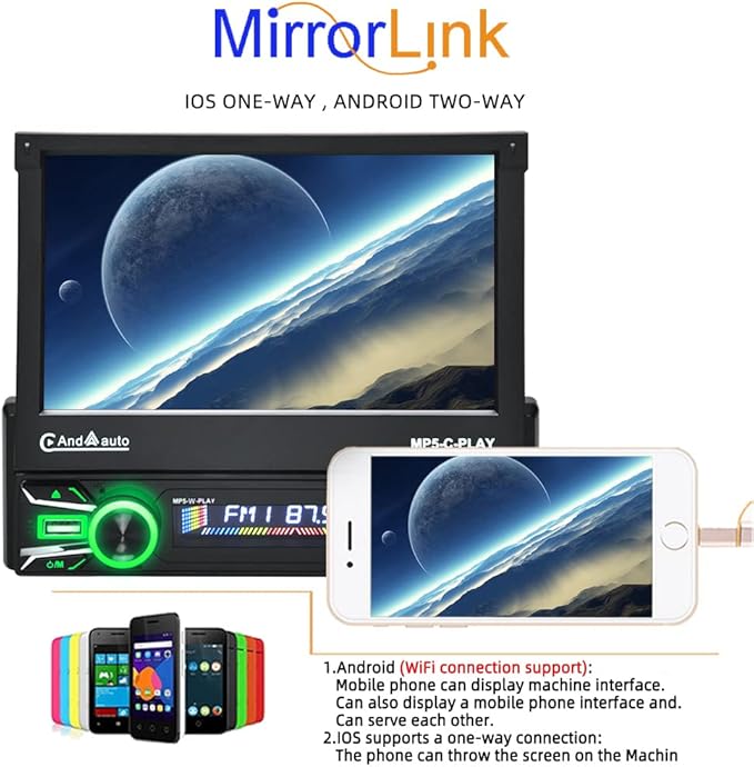 • Mirror Link for Android/IOS: Car Radio Supports Mirror Link Function. You can connect your phone to your car radio with an original data cable, easily connect and synchronize content (video, GPS, etc.).