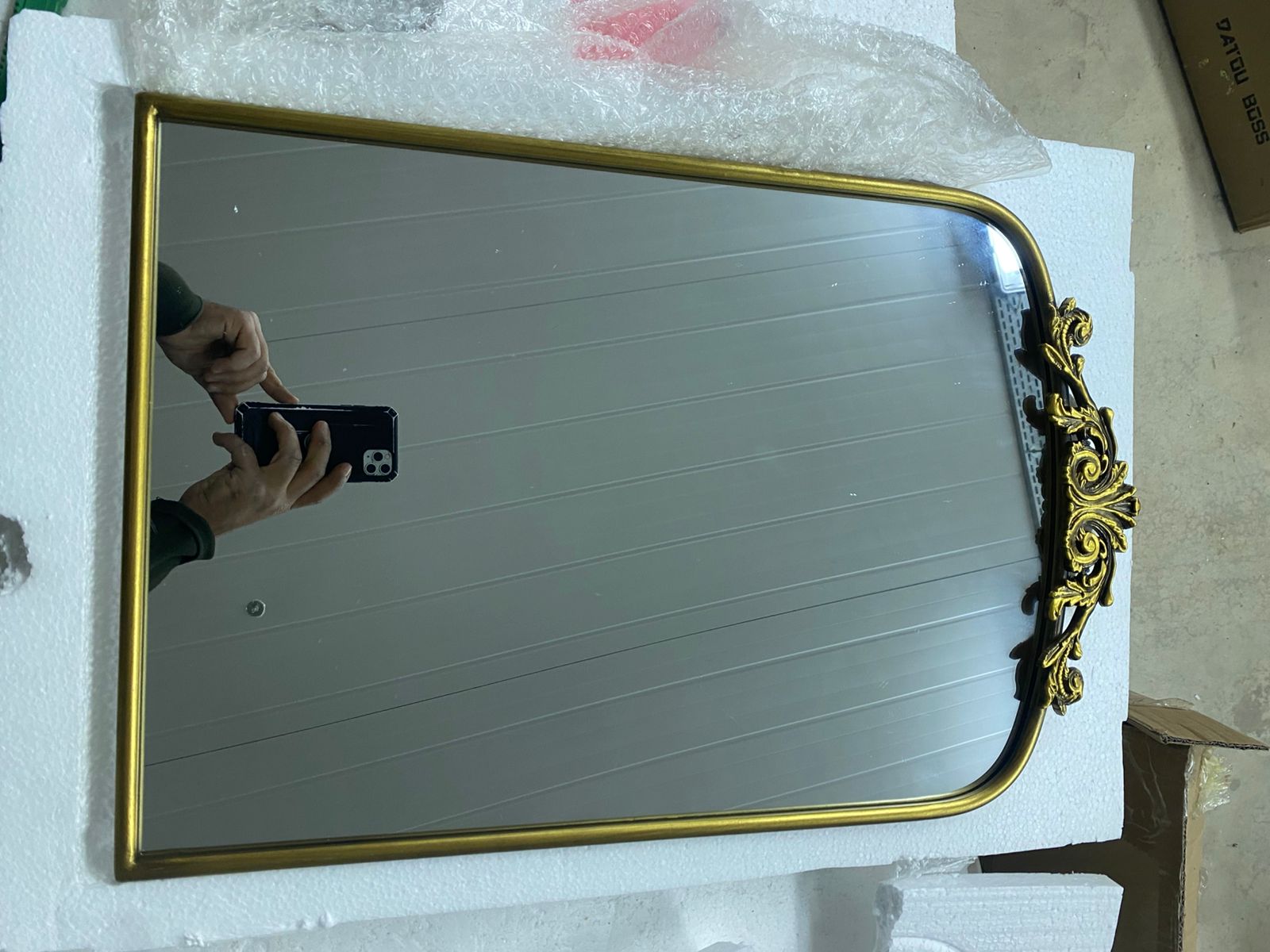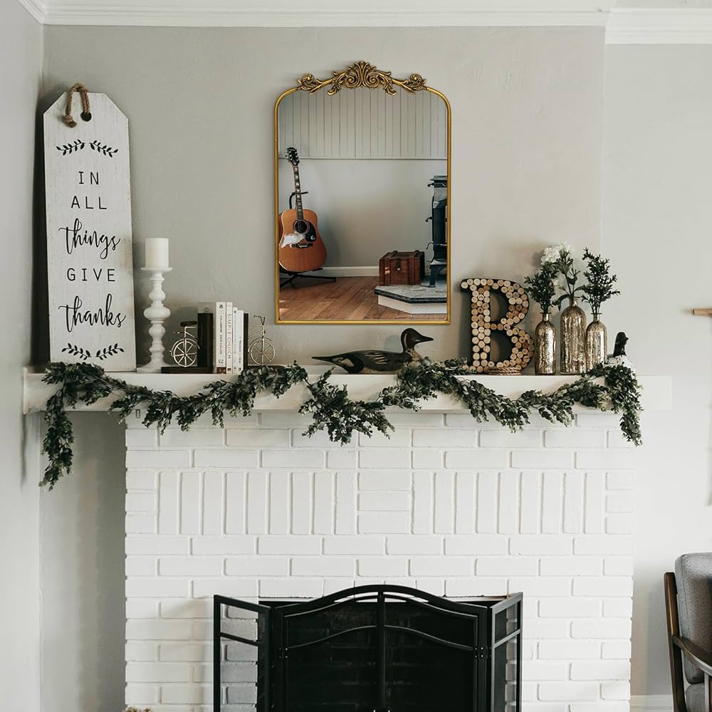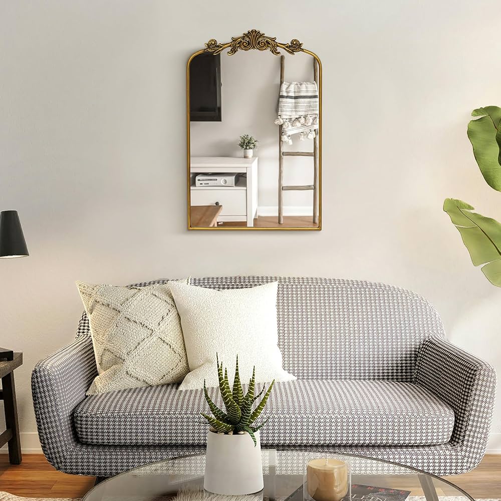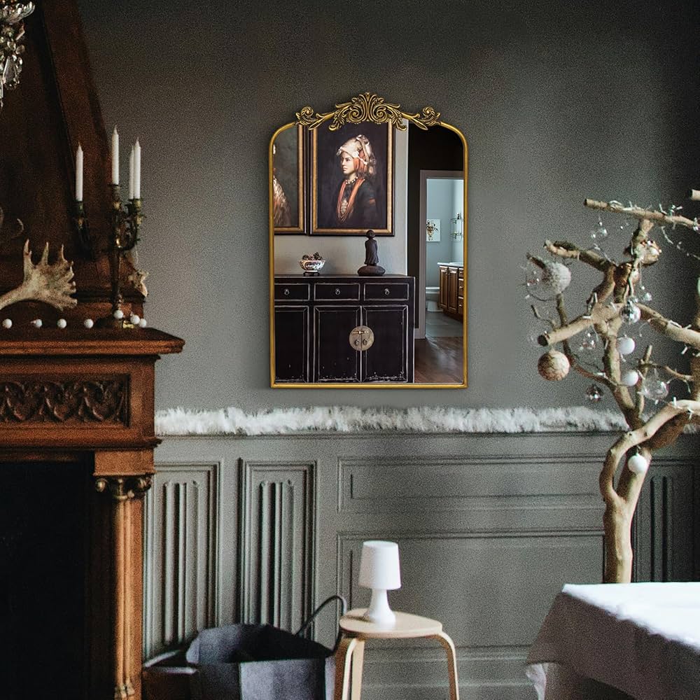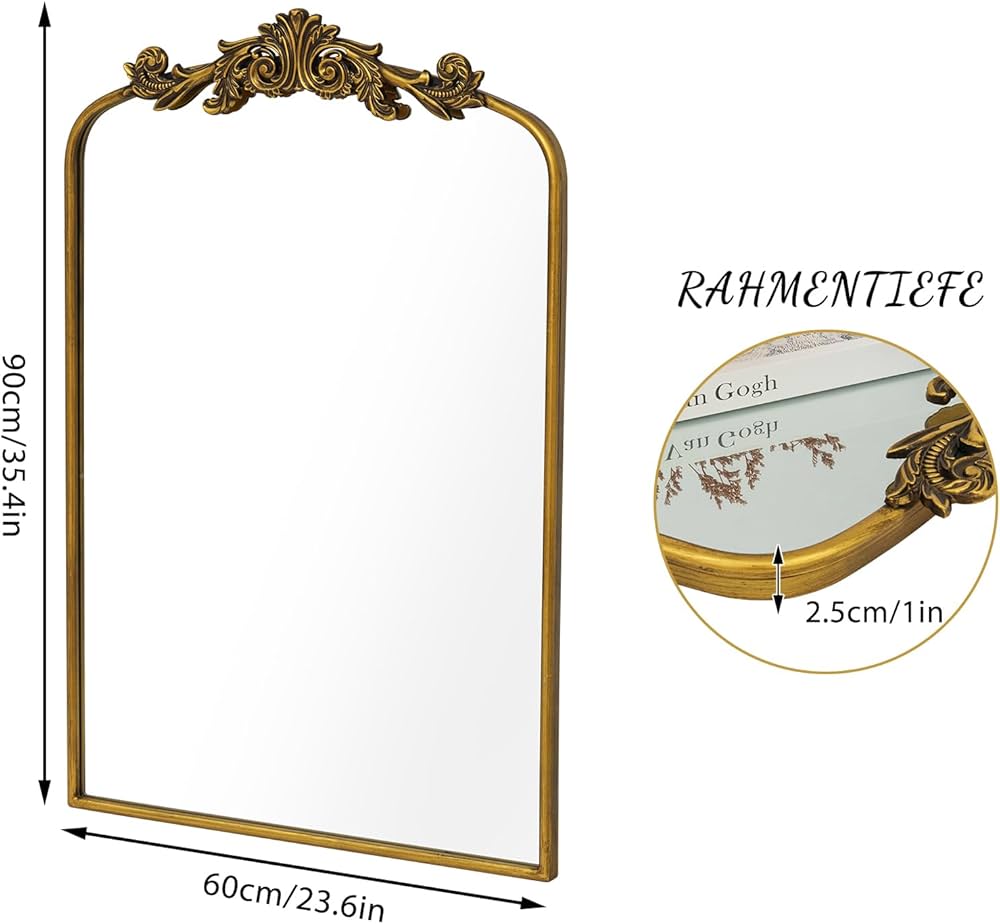 VINTAGE MIRROR FRAME – This traditional vintage arched mirror has an ornate baroque style. The elegant carved patterns at the top of the arch combined with gold tones add a vintage touch to any room.