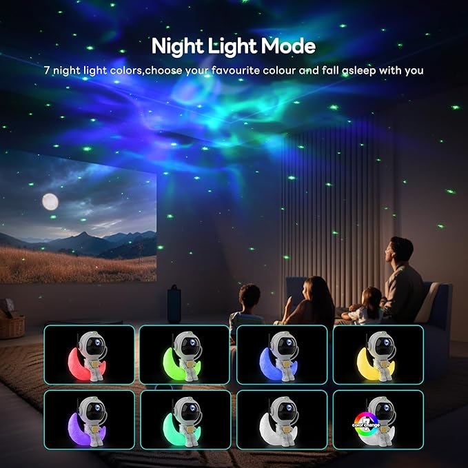 - 【Star Lights Projector + Galaxy Projector + Night Light】: The moon lamp, under the cute astronaut seat, is a night light with 7 colors. If you want to see an amazing galaxy and twinkling stars, or want to have an amazing night light in your bedroom, this astronaut light projector must be your best choice.