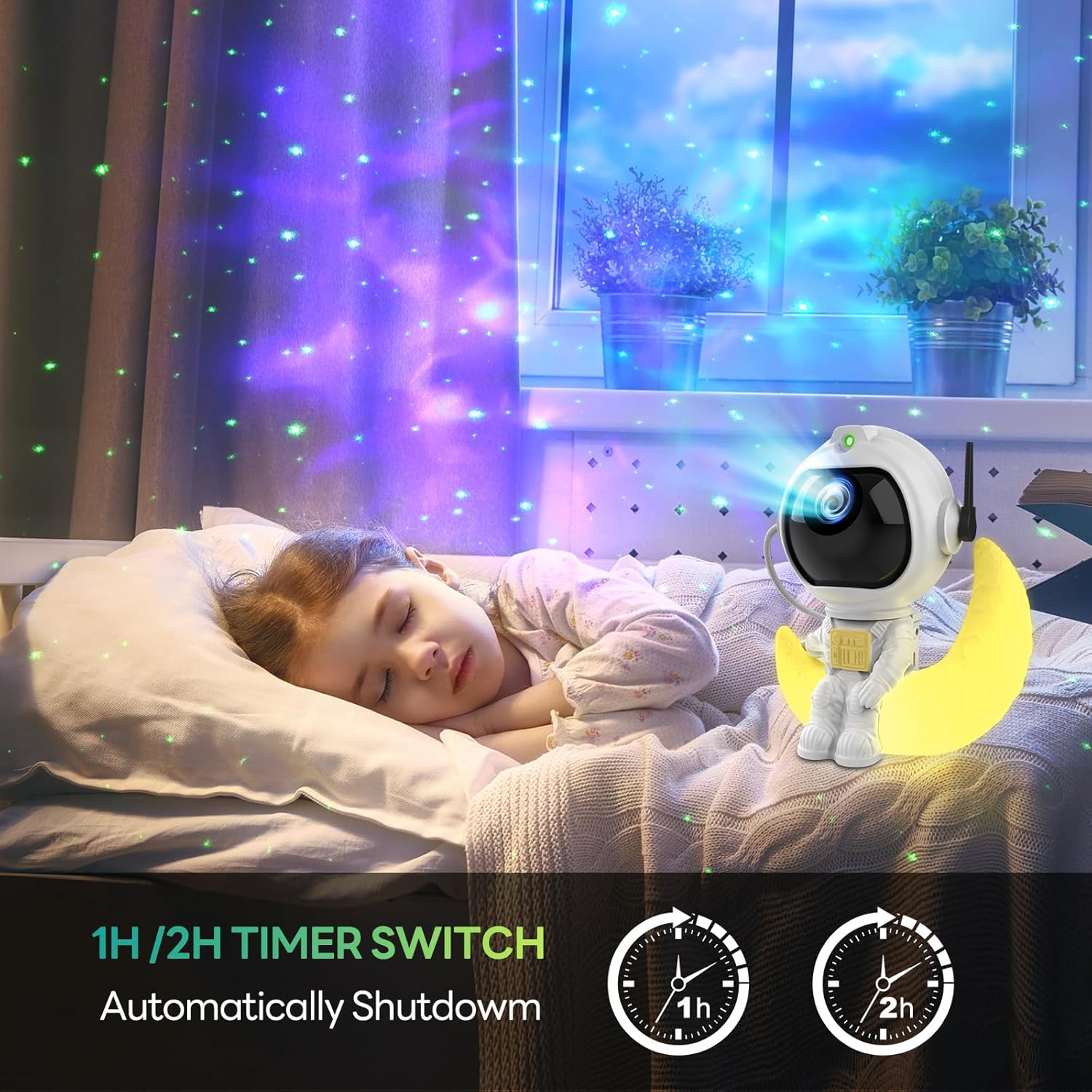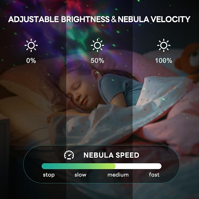- 【1h/2h Sleep Timer】: The starry sky projector for children has a timer function (1H timer, 2H timer and cancel timer) that automatically switches off when your child goes to bed to save electricity. Various rotation speed settings improve use as a night light and optimize the viewing experience for you and your family.