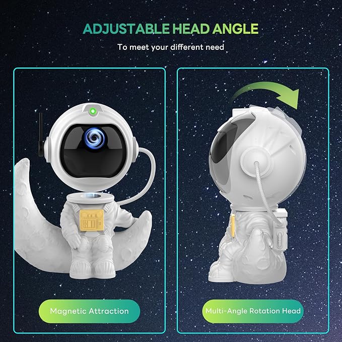 - 【Unique and Flexible Projection Design】:The head of the astronaut galaxy projector are connected by magnets, it is removable. so that you can apply it by turning your head or take it off from the body and project anywhere you like, creating a wonderful and dreamy environment for your baby room、bedroom、car、tent、and so on