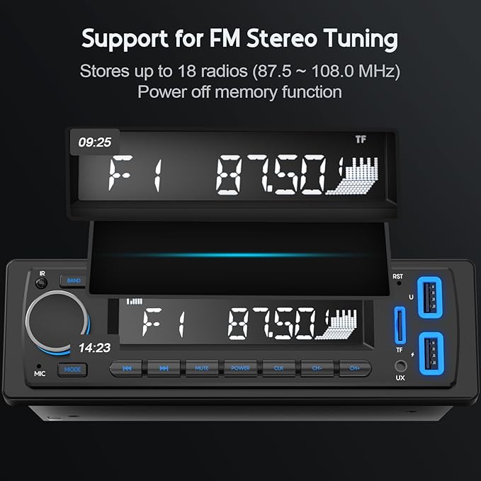 - 🐒【FM Tuner Function】Our Bluetooth car stereo can receive radio in stereo FM frequency (Frequency range: 87.5-108.0 MHz) and can record up to 18 radio shows, allowing you to receive signal information more reliably. In addition, the power-off memory function also keeps the saved stations even if there is a power failure.