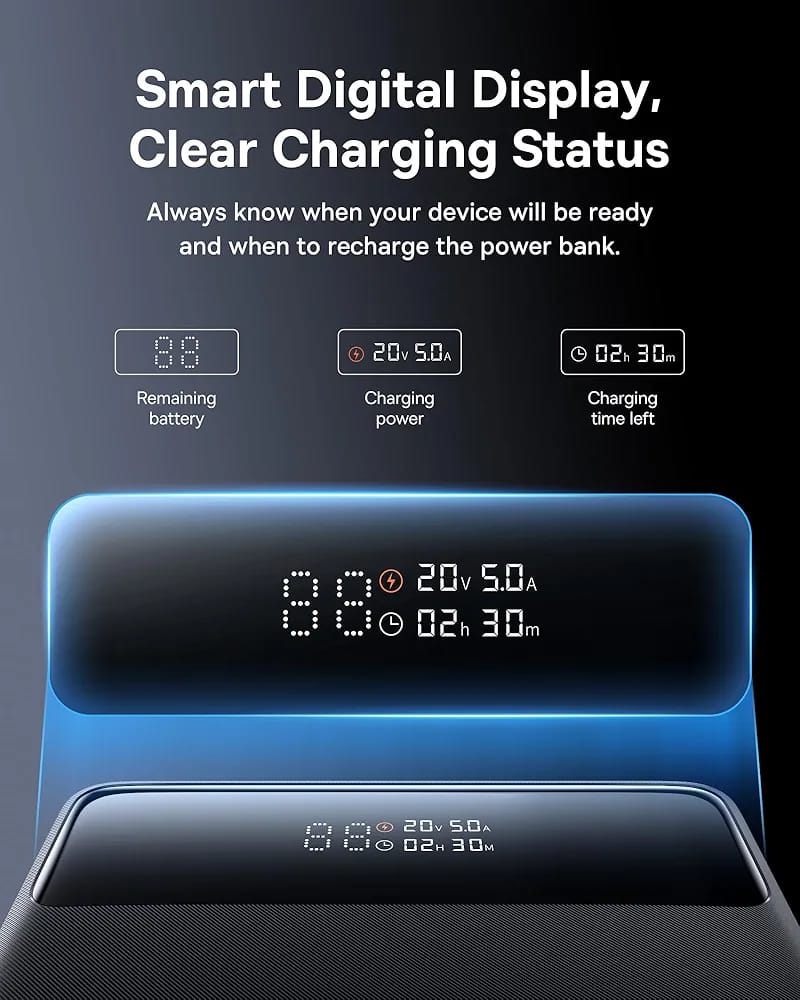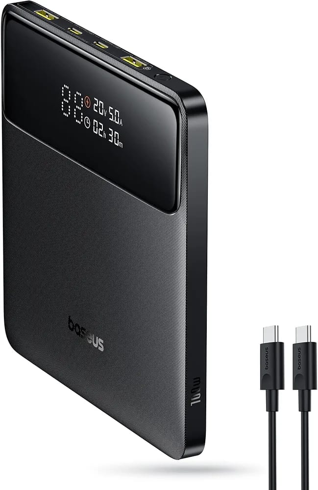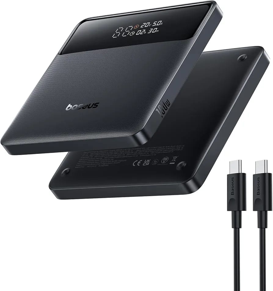100W Super Fast Charging: the Baseus 20000 mAh power bank is equipped with 2 USB-C ports, which are certified with PD 3.0 and PPS and provide a power of up to 100 W. This allows you to power your MacBook Pro 16 inch with the Baseus battery bank and charge it to 50% in just 30 minutes. With the included USB-C to C cable and a 65W USB-C PD wall charger (not included), you can shorten the charging time to 1.2 hours.