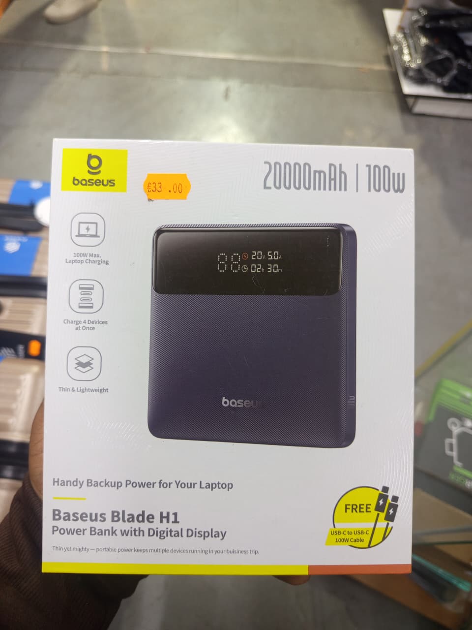 What you get: The Baseus 100W fast charging power bank for laptops supports fast charging protocols PD 3.0, QC.4.0, SCP and FCP. The set includes the Baseus 100W 20000mAh slim power bank for notebooks, a USB-C to C fast charging cable and a 24-month warranty. (If you have any questions about the product or other aspects, please contact us at any time!)
