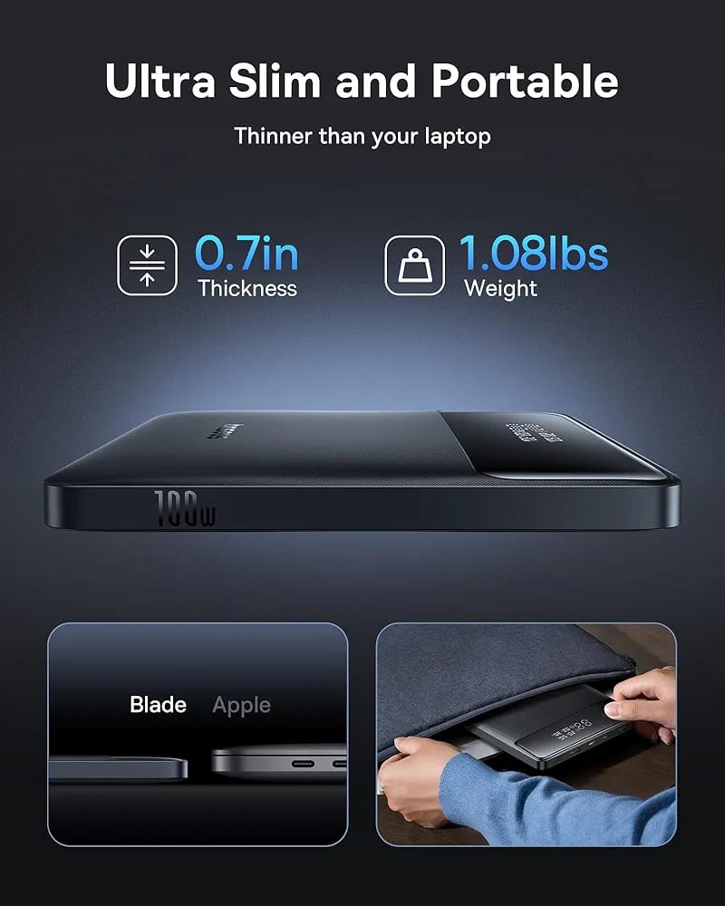 Lightweight and slim design: this laptop power bank has only a thickness of 0.7 inches and is therefore thinner than a notebook. As a high-density version, the Baseus portable charger uses silicon carbon battery technology, making it 18% lighter and 20% smaller than older versions. The slim design allows you to easily store it in your bag and take it anywhere. The unique LED status light allows you to easily track the charging status and remaining charging time. The orange flash symbol indicates fast charging. During charging, the remaining charging time is displayed.