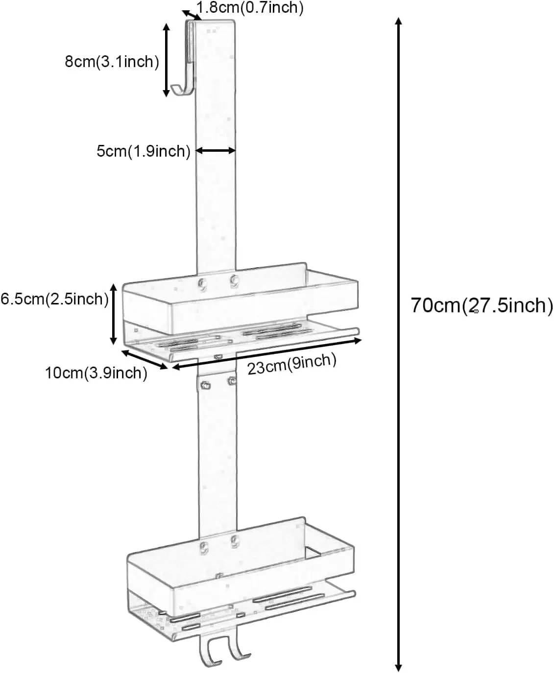 - Multiple uses: the hanging shower basket does not need to be drilled and does not damage the wall, it is very suitable for places such as bathroom, kitchen, balcony, garden, etc., it can store various toiletries and accessories