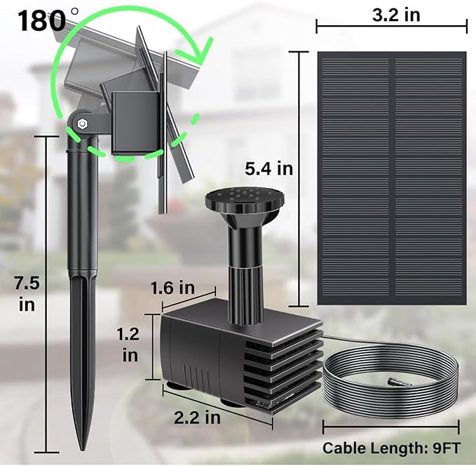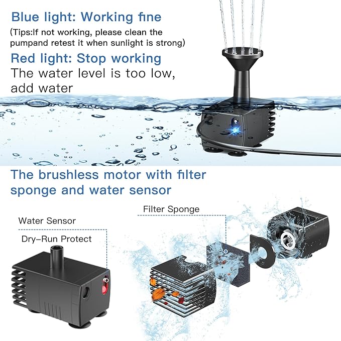 - High Quality Solar Fountain Water Pump Kit: Equipped with 180° rotatable high-efficiency solar laminates panels, the solar water fountain pump has more than 10,000 hours of lifespan, delicate and perfect. Built-in brushless motor that provides a longer service life and lowers energy consumption