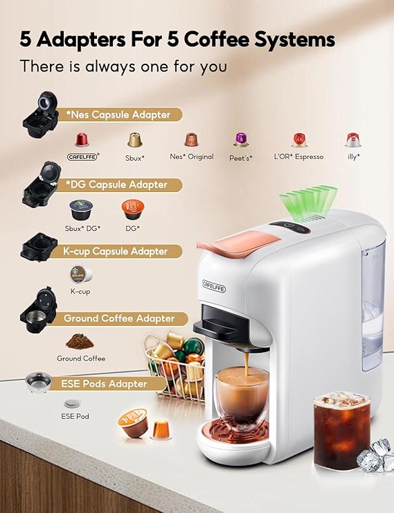 - 【5-in-1 Compatible with Pods and Espresso Powder】This pod coffee maker can be perfectly compatible with Kcup* Pod, Nes*, DG* Capsule, E.S.E. Pod and Espresso Powder. You don’t need to buy a variety of coffee machines because of different pods, this will save you a lot of money.