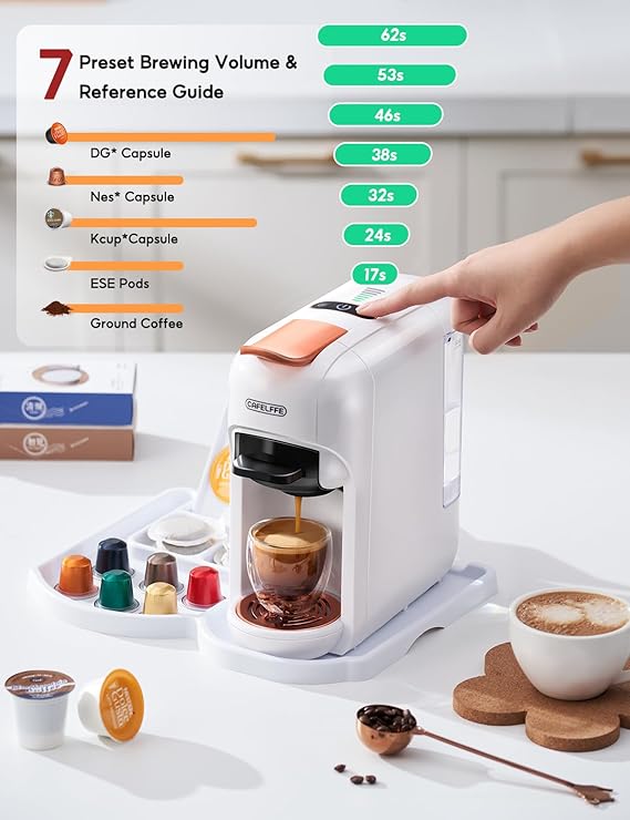 - 【New 7 Preset Brewing Volume】CAFELFFE NEW UPGRADE LED BAR INDICATOR which is perfect match with your DG* capsule. Please adjust brewing volume as you need, a cup of tasty Italian Espresso/Lungo/Americano can be completed within 1.5 minute!