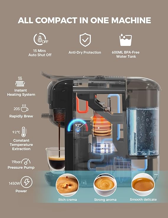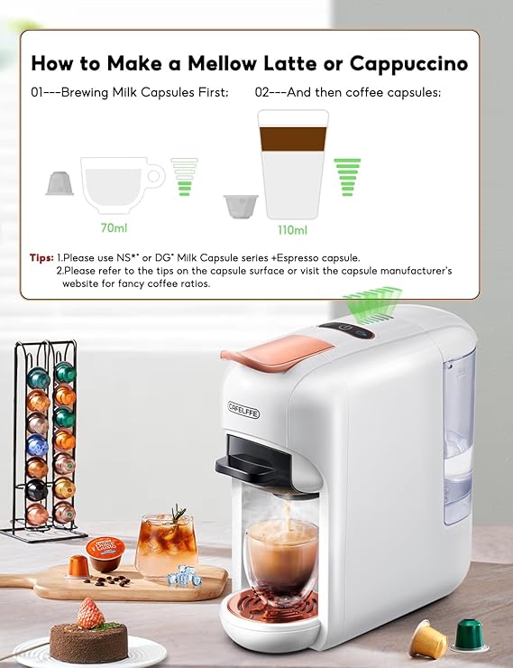 - 【19Bar Pressure Extraction & Pre-Infusion Technology】CAFELFFE Capsule Coffee Machine is equipped with a 19 bar high-pressure pump and pre-infusion technology that can fast immerse the coffee powder/ capsule to ensure high-quality extraction from coffee capsule/powder, letting you enjoy espresso with rich crema every brewing.