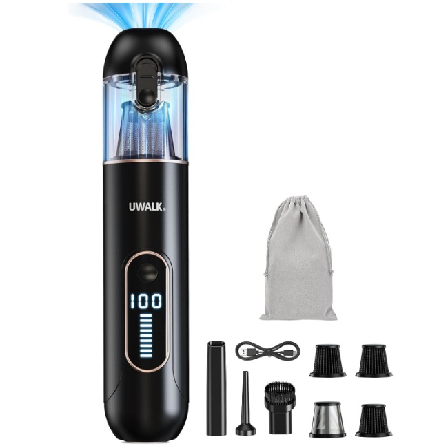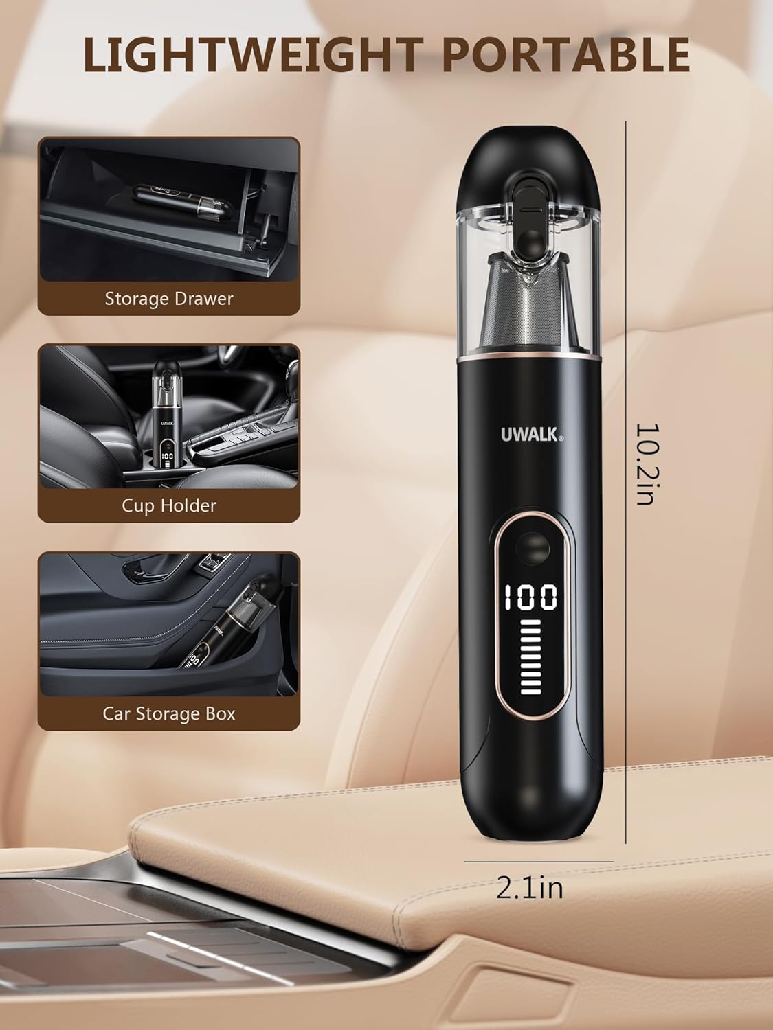 • LIGHTWEIGHT PORTABLE, DOUBLE FILTER: The rechargeable wireless vacuums improves the bulky weight and cord tangling problems of traditional car cleaner with a compact body design, measuring only 10.2 inches * 2.1 inches * 2.1 inches, and weighing 0.99 pounds, so it can be freely stowed in your car without taking up extra space. The vacuuming cordless adopts a double-layer filtration system, stainless steel filter plus high-standard cartridge, which effectively separates dust and air, reduces secondary pollution and provides more efficient cleaning ability.