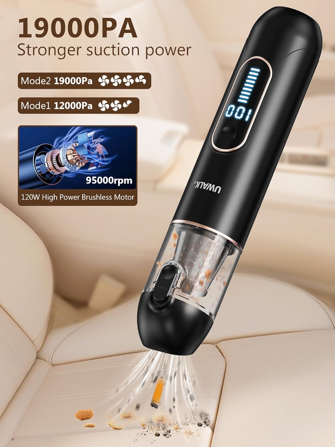 • 19000PA MORE SUCTION POWER: Our vacuum cleaner cordless has super stronger suction power, equipped with a powerful 120W motor and up to 95,000rpm, which can easily pick up stubborn dust, debris, animal or dog hair etc. The hand held vacuum cleaners has two power modes, 12000PA and 19000PA, which can meet different cleaning needs and instantly refreshes your environment.