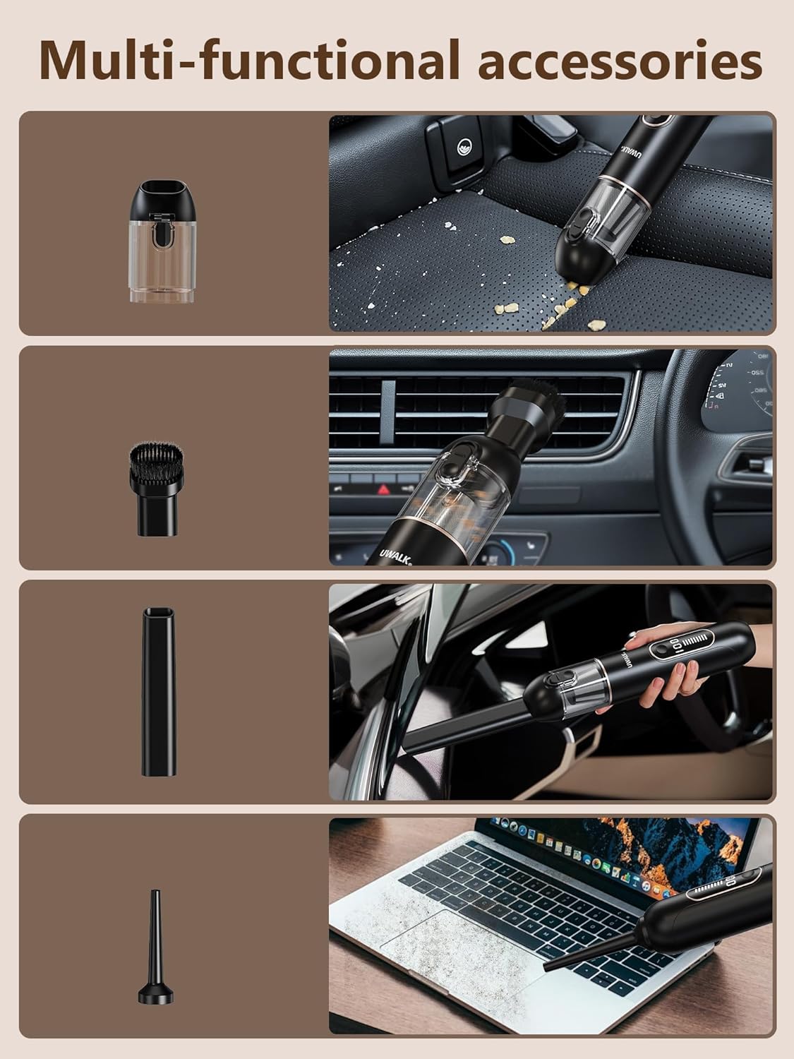 • COMES WITH 3 ACCESSORIES: Our cordless vacuum comes with 3 practical accessories, the long nozzle can be used for crevice corners, such as car seats, sofas, bed crevices, short bristle brush can be used to clean the air conditioning vents in your car, and the blowing nozzle not only blows away dust from your keyboard, but also can be used as an inflatable pump or small blower. The mini hand held rvacuum cleaner can be used in a variety of scenarios such as desktops, stairs, carpets, bedrooms, tables, works, kitchen.