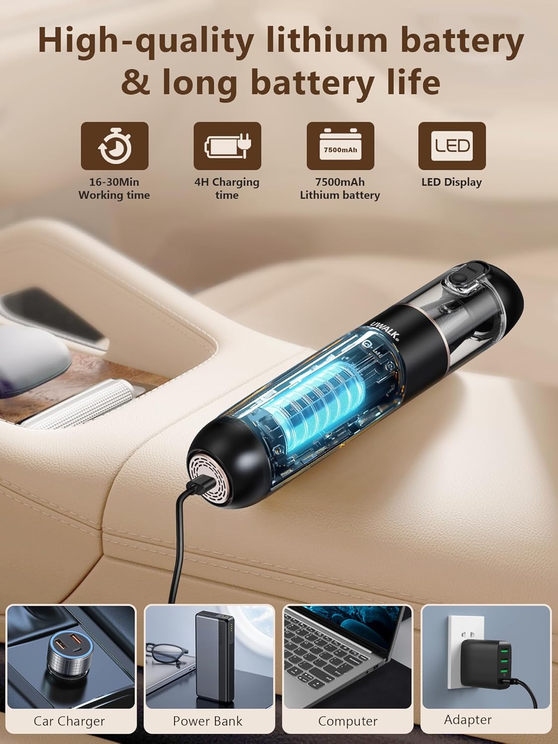 • 7500mAh HIGH CAPACITY BATTERY: The car cordless vacuum has a built-in 7500mAh high quality lithium battery, it can work for 16-30 minutes in 2 suction modes. The handheld cordless vacuum can be fully charged in 4 hours and can be recharged in the car USB slot or using a standard charger, computer, mobile power or various storage devices to make charging easier.