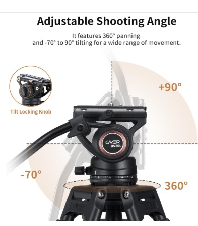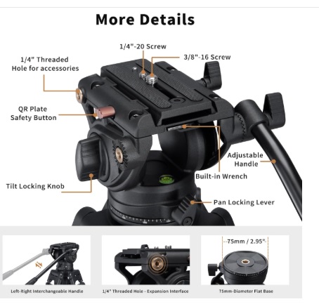 - 【Fluid Head with Smooth Control】: Features a 75mm flat base fluid head offering 360° panning and -70° to +90° tilt. Side lock design ensures quick and secure attachment of sliding quick release plates.