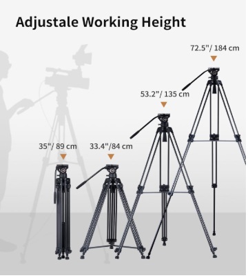 - 【Stable & Adjustable Design】: Heavy-duty twin tube tripod legs with a mid-spreader provide stability. Height adjusts from 33.4″ to 72.5″, and the fluid head tripod folds to 35″ for easy transport in the included carrying bag.