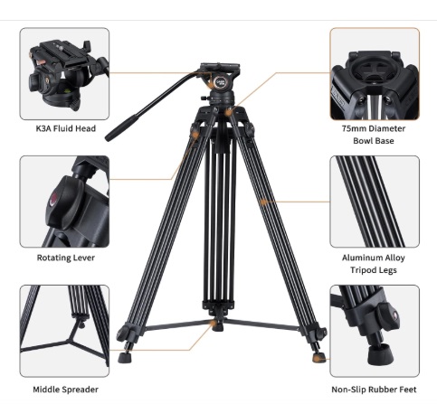 - 【Complete Video Tripod System】: Includes a two-stage aluminum tripod with mid-level spreader and K3 fluid head, supporting up to 13.2 lbs. Perfect for DSLR cameras, camcorders, and other video equipment.