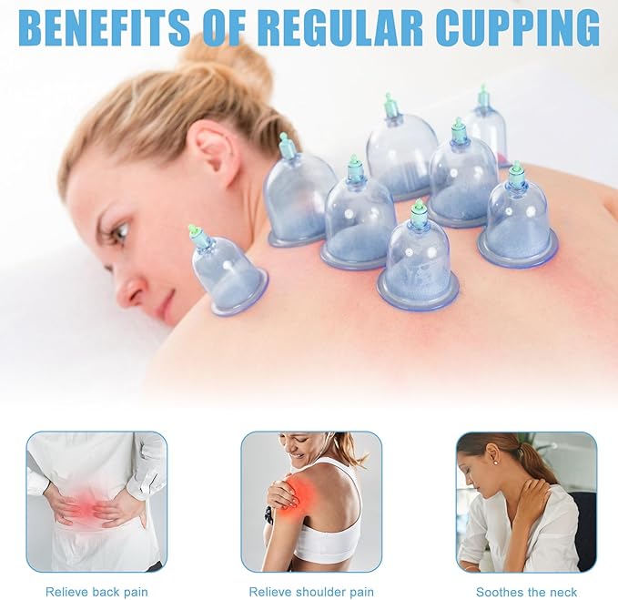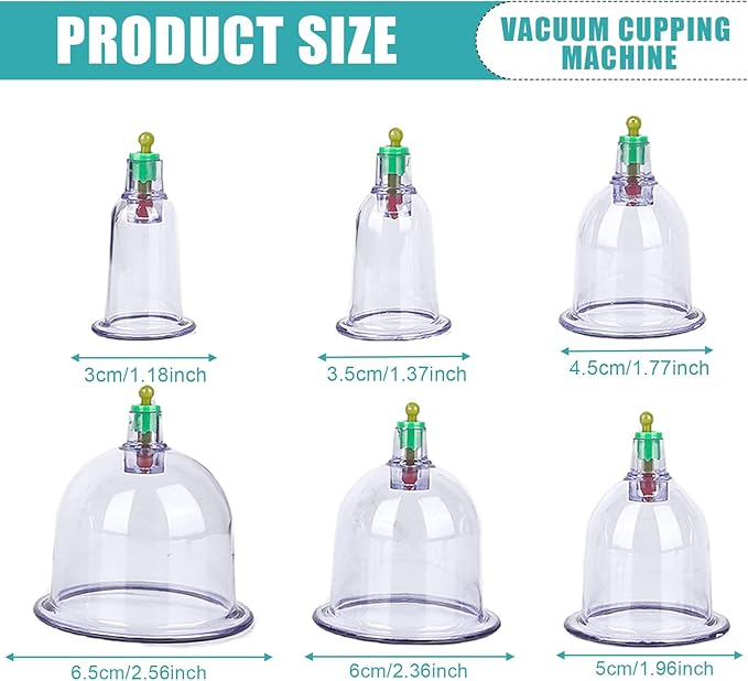 - Widely used: the cupping suit is very small, compatible perfectly with any body area and easy to carry. Cupping glasses with vacuum pump powerful functions can be used on any part of the body. Vacuum pump set can relieve tension, anti-cellulite, relieve muscle and joint pain and promote blood circulation and eliminate body toxins. You can use them anytime and anywhere, can be used individually or in combination as needed.