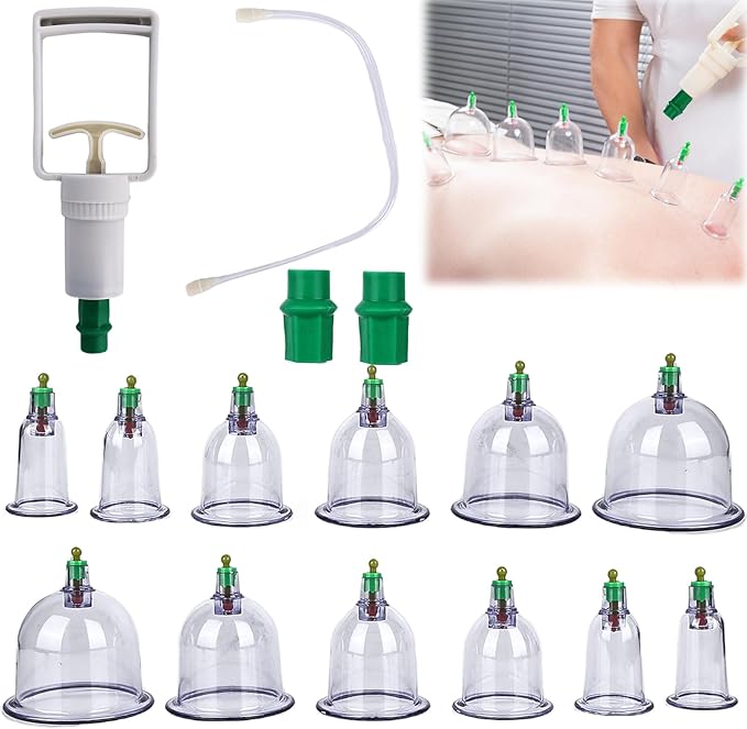 - 12-piece cupping glasses with vacuum pump set: 1 cupping gun, 12 cups, 2 magnetic heads, 1 connection hose, 1 manual (English language not guaranteed).