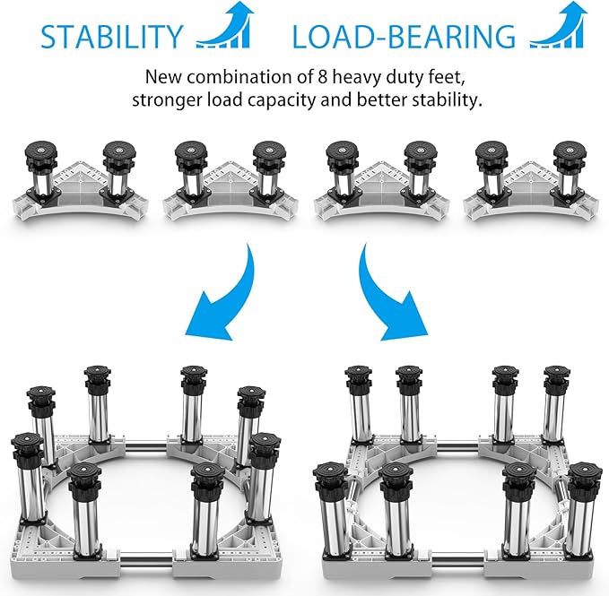 - Adjustable Base: This washing machine base comes with 8 feet, adjustable length/width on both sides 43-57 cm, height increase 18-20 cm, weight capacity up to 450 kg, ideal if you have a refrigerator, washing machine, dryer, freezer, flower pot, cabinet or other furniture. 💗🕬Note: Length and width are adjustable to accommodate household appliances