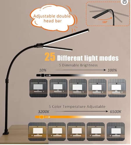 • 【Modern looking & Saving Space】 Double head design + gooseneck design, the gooseneck desk lamp can be flexibly adjusted to 360° according to your needs. And swing arm desk lamps for home office adopts clamp design, so this small desk lamp is suitable for small space