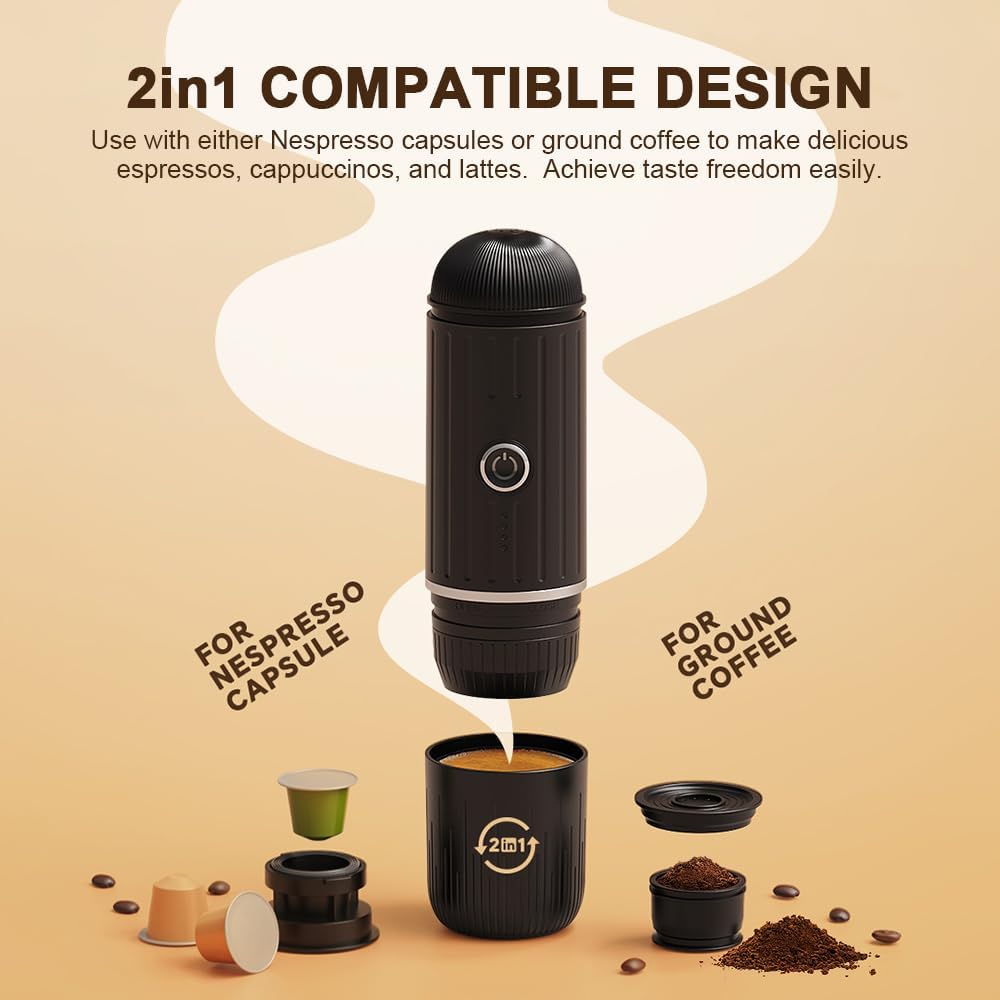 - ⚽【Multi-functionality and Versatility】 – This versatile coffee machine is compatible with both coffee powder and Nespresso capsules, offering you various options for making different types of coffee. Whether you prefer an intense Espresso, a smooth Americano, a creamy cappuccino, a frothy latte, a rich mocha, or a delightful macchiato, this portable espresso maker can fulfill your desires.