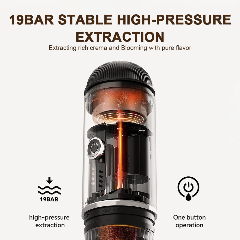 - ⚽【High Pressure and Powerful】 – With a 19-bar high-pressure pump and a 100W wireless electric motor, this portable coffee maker delivers a rich and flavorful cup of coffee every time. Whether you prefer using coffee powder or compatible with Nespresso capsules, this coffee maker is compatible with both, allowing you to customize your coffee experience according to your taste.