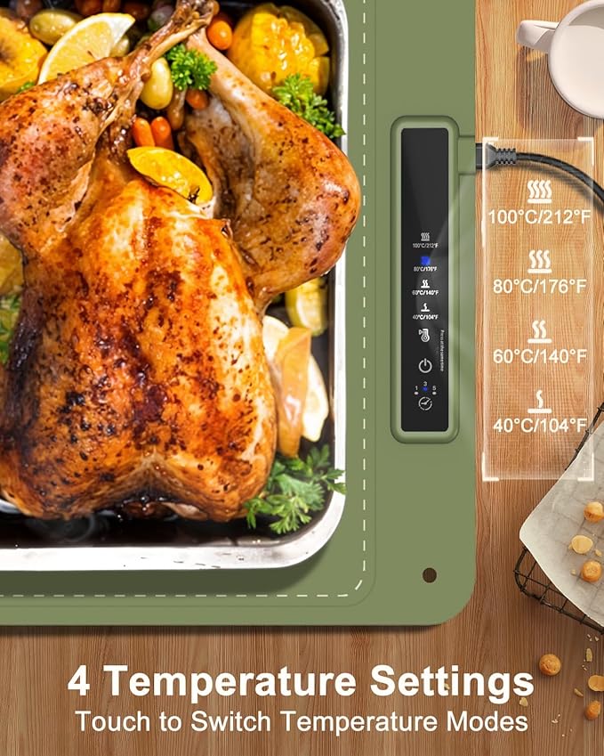 - Adjustable Temperature Control for Every Occasion: Advanced heating technology allows you to choose from four temperature settings—104°F, 140°F, 176°F, and 212°F—offering the perfect warmth for different foods in any setting. Even for hours on end, this mat maintains ideal warmth without overcooking, so your food stays just right in both taste and texture. Guests can enjoy warm food all night, enhancing their dining experience.