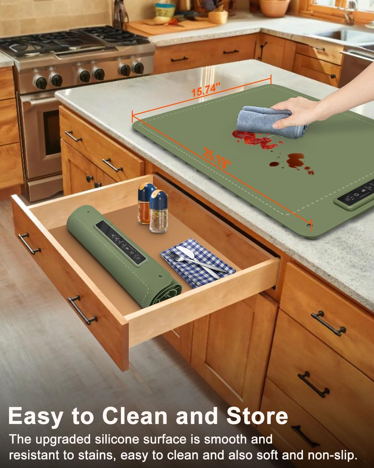 - Flexible & Premium Silicone: Made from high-quality, food-grade silicone, this warming mat is durable, heat-resistant, and non-toxic. Its soft material allows it to be rolled up for storage in a drawer or hung on the wall, keeping your counters neat and organized. Plus, it’s super easy to clean, giving you more time to enjoy your meal.