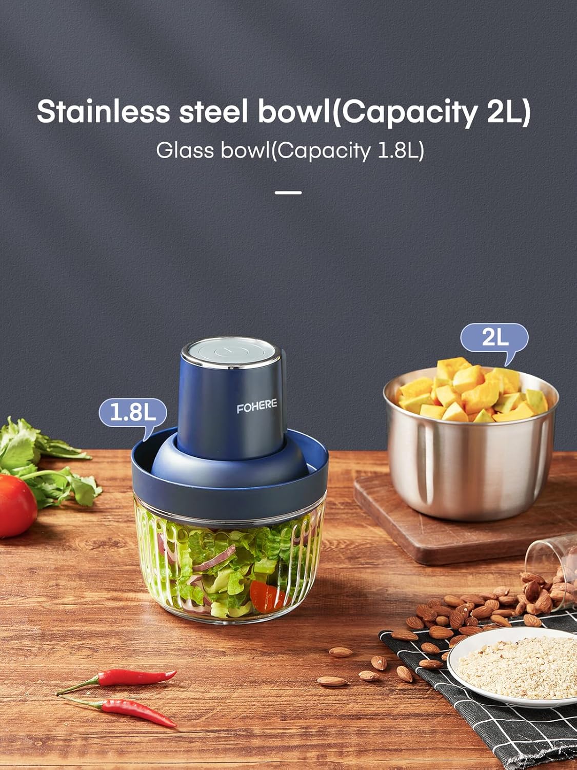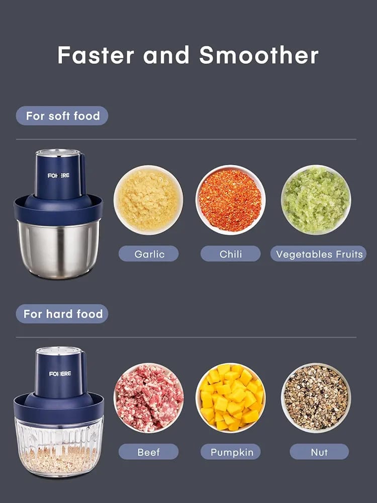 FOHERE Food Processors, Electric Food Chopper with Meat Grinder & Vegetable Chopper with 2 Bowls (8 Cup+7 Cup), 2 Sets of Bi-Level Blades for Fruits/Meat/Nuts/Baby Food, Blue.