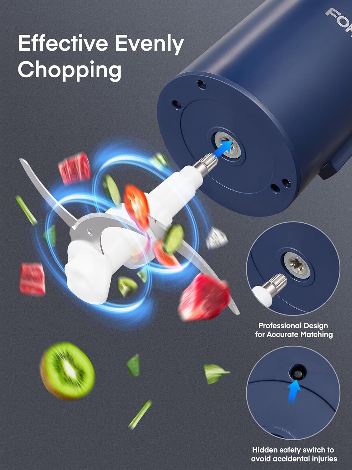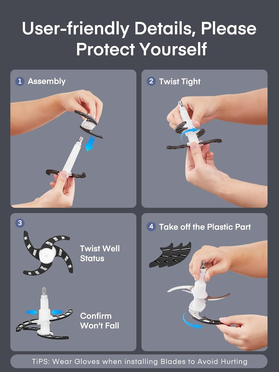 【How to Operate】Install the blades,put it into the bowl. insert the blade assembly into the spindle pin, Next, match the pure copper motor with Knife pin ▲ on the cover, the Seperated design is easy to clean (Clockwise lock ,anticlockwise separate). This design ensures food hygiene. Once you pop the motor, the blades will immediately stop rotating. Continuously check and continue if desired.