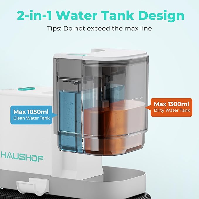 - 2 in 1 Water Tank Design for Easy Cleaning: Featuring a 2-in-1 water tank system with a 35oz clean water tank and a 44oz dirty water tank, this furniture cleaner allows for extended cleaning sessions without frequent refilling or emptying. Enjoy more efficient cleaning and complete household tasks effortlessly