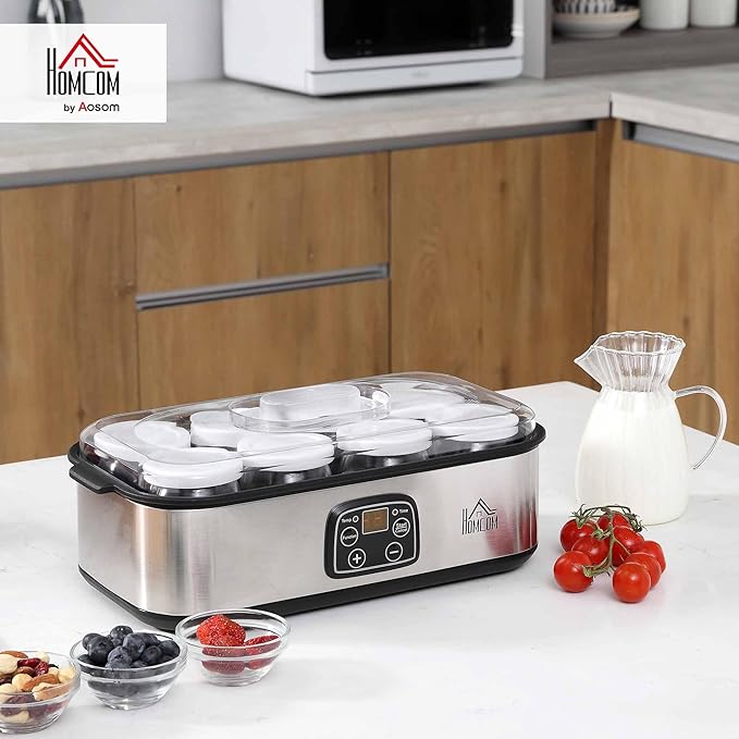 HOMCOM Yoghurt Maker Greek Yoghurt Machine with Lid, 8 BPA-Free Glass Inner Containers of 180 ml, Yoghurt Maker with LCD Display Timer, for up to 1.4 Litres Yoghurt 25 W, Silver