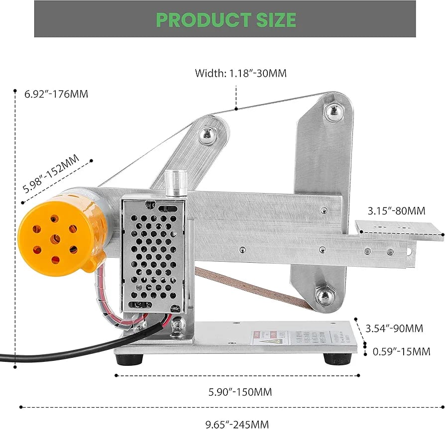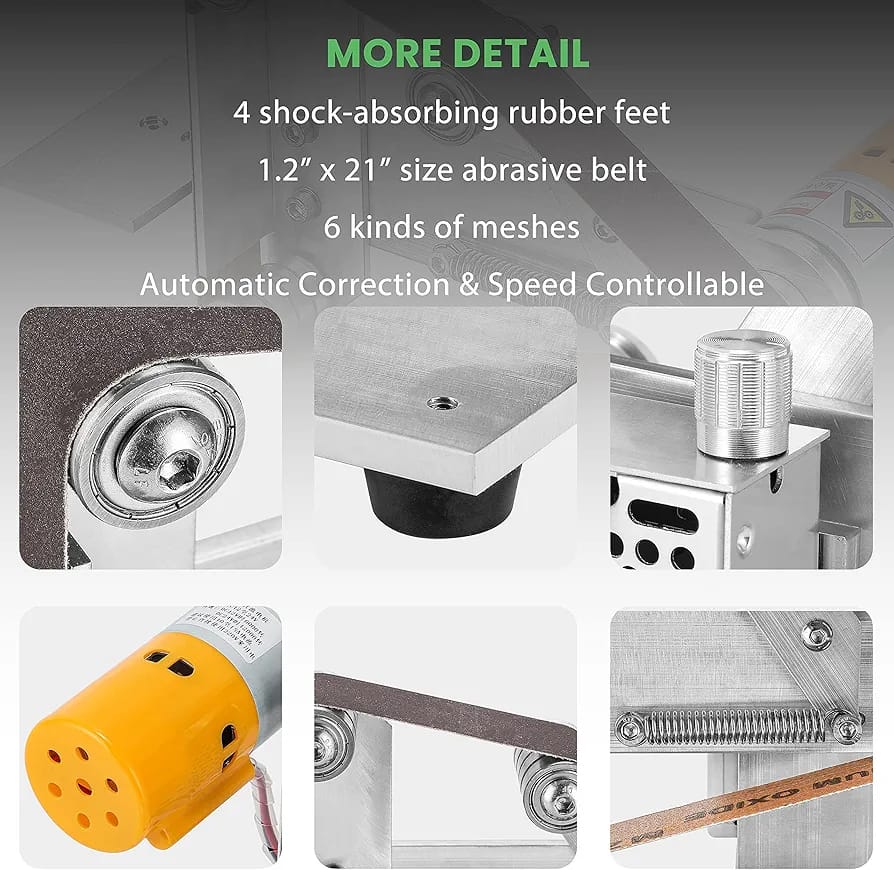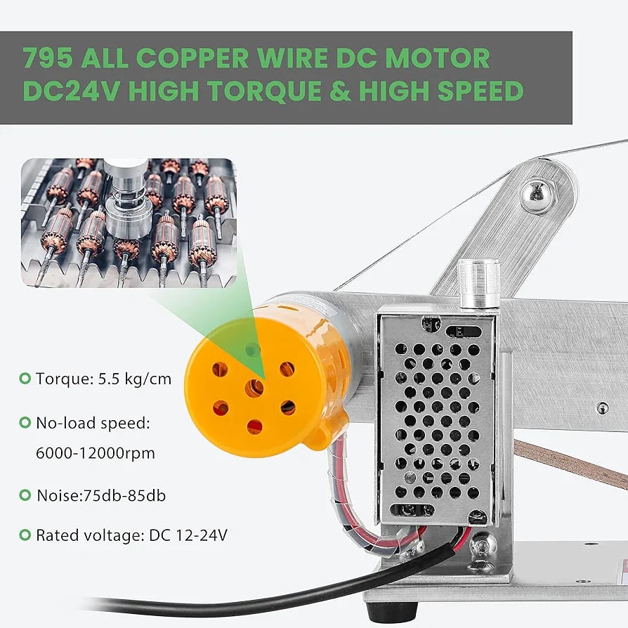 【Automatic Belt Correction& Speedless Regulation】The Drive wheel is designed with a rib, the belt will automatically goes straight, avoiding belt deviation; the motor alone provides 12000rpm under 24V, even when loaded with belt sander, the working rotation still goes around 0-4800rpm high speed, it can be adjusted freely by 360°turning the switch.