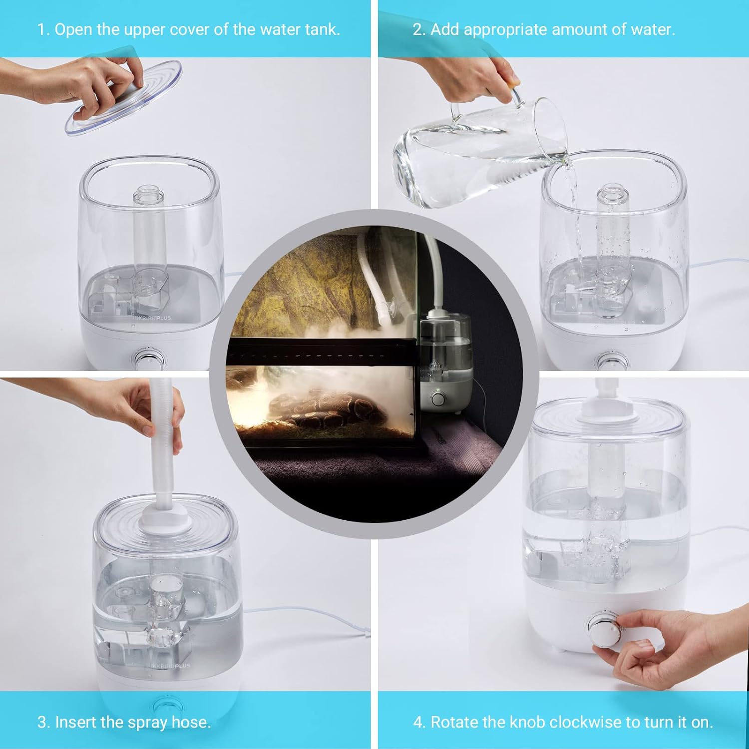 - 🦎🐍🐸【SUPER EASY TO USE】This humidifier is easy to install, easy to use. It features a top-fill design for convenient water injection and a one-button operating function. By rotating the knob, you could turn on/off the humidifier and adjust the misting amount under its working state.