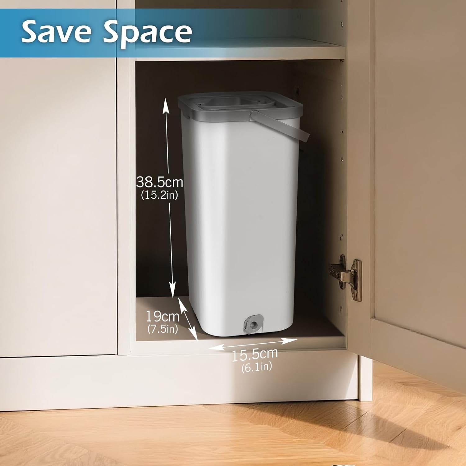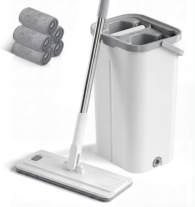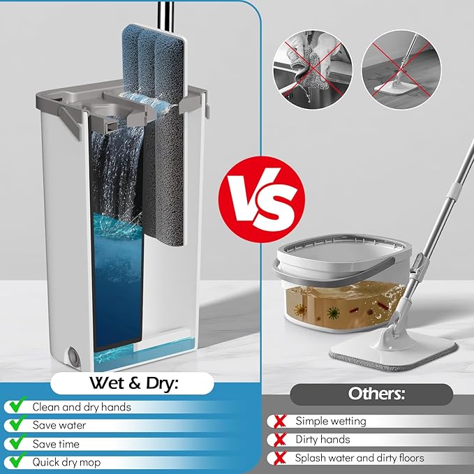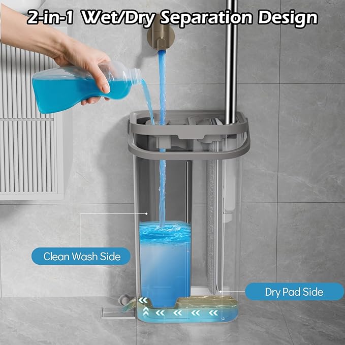 • Space-saving:The four-section handle is detachable, featuring a hanging hole at the top. The mop bucket’s compact dimensions (15.2 x 7.5 x 6.1 inches) allow for efficient storage in cupboards or corners without taking up valuable space. Leaves no marks on solid wood, laminate, tile, vinyl, or marble flooring. Wet use delivers deep cleaning with streak-free shine, while dry use effectively removes dust and pet hair.