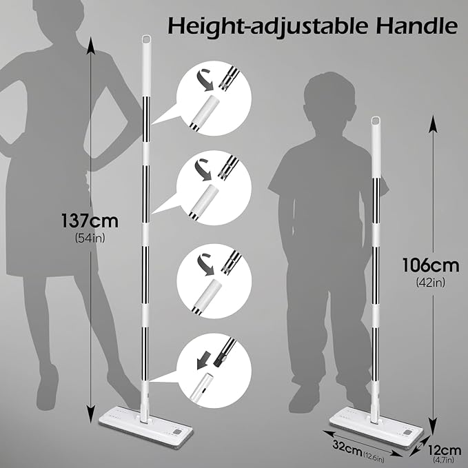 • Multi-Functional Mop Head:The 32cm-wider flat mop head efficiently cleans larger floor areas. Its 360° flexible rotation effortlessly glides under sofas, beds, and cabinets to remove hidden grime. An added water-scraping strip on the back easily directs bathroom or kitchen water towards drains, eliminating the need for repeated wringing and maximising versatility. Reinforced snap-lock design outperforms basic Velcro fastenings, offering superior durability and resistance to loosening or deformation.