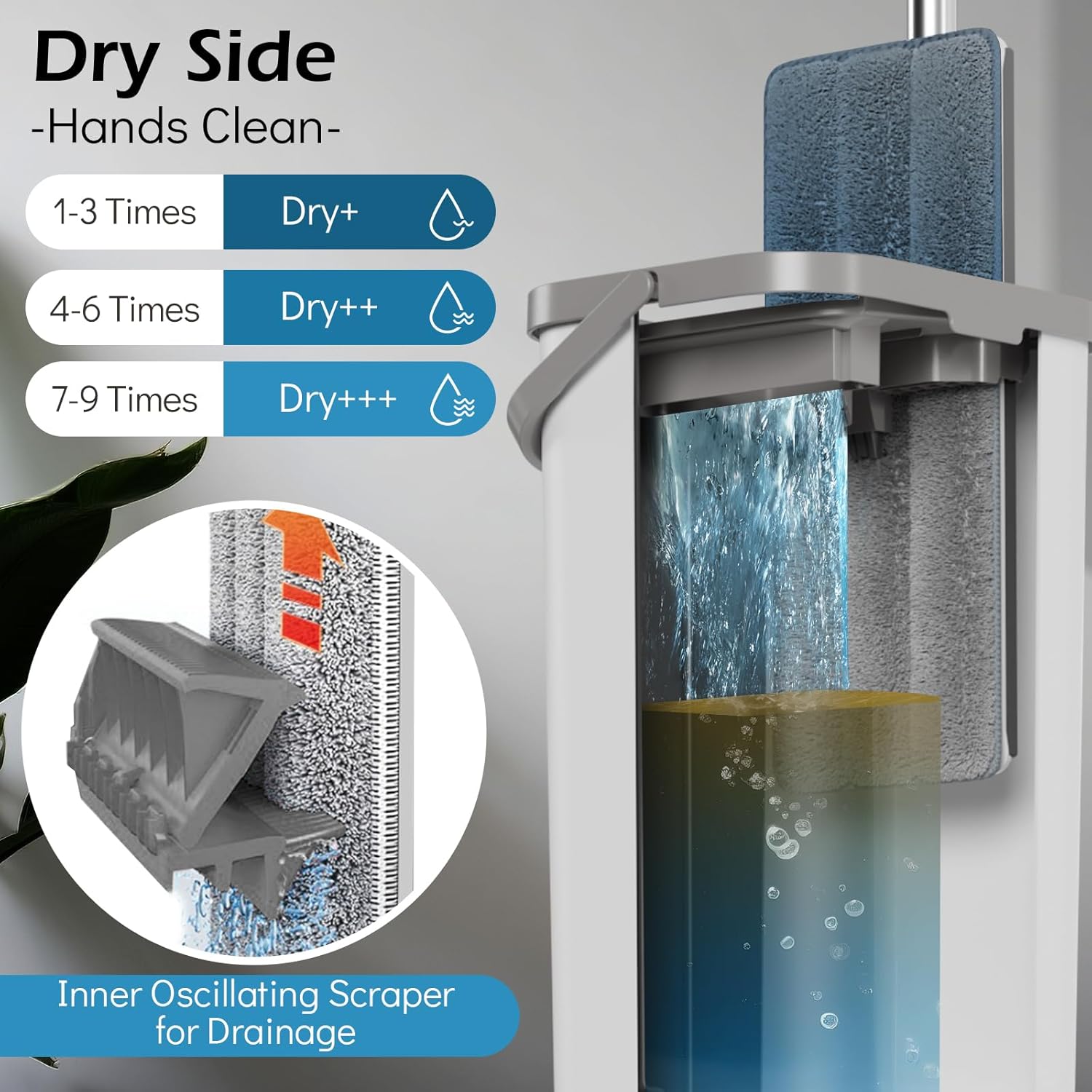 • Hygienic Dual-Bucket System:This self-cleaning mop set features a compact, lightweight dual-compartment bucket that separates clean water from dirty water. Equipped with a cleaning brush and wringing scraper inside the bucket, stubborn stains, hair, and accumulated water are effortlessly removed with a simple push-and-pull action. The entire process keeps hands dry and hygienic. Additionally, the wringing bucket features a drainage hole at the base for effortless emptying of accumulated water.