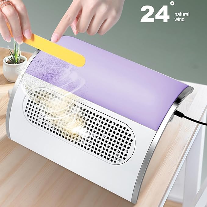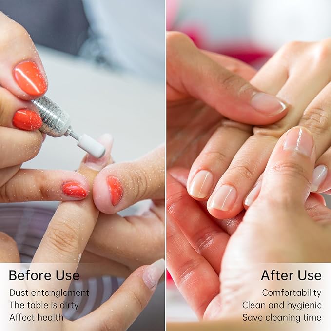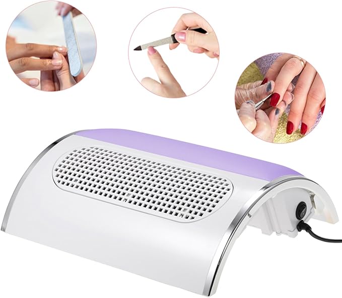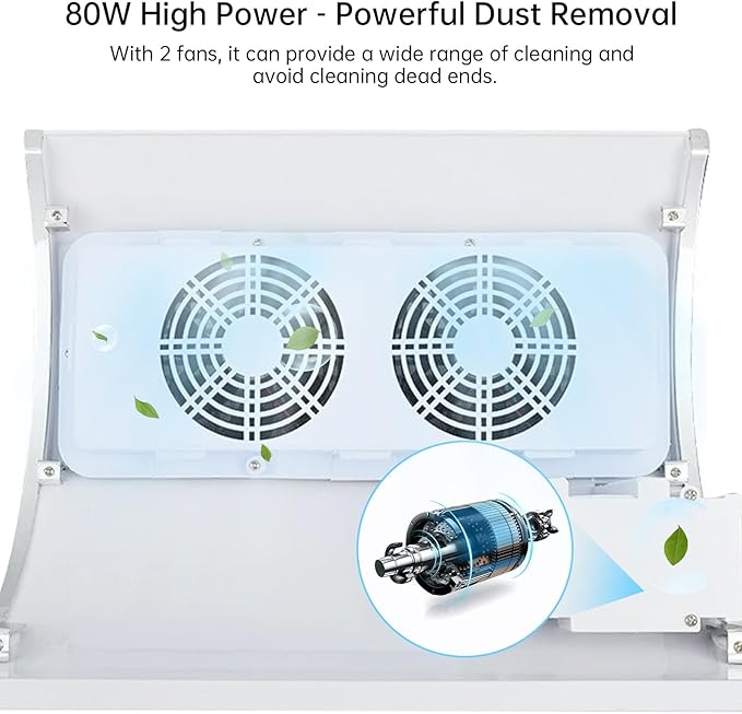 - Nail Dust Collector High Power 80W – Nail dust collector with 2 powerful fans, 80W of high power can effectively suck in all nail dust from all directions makes you away from dust Inhalation, 100% vacuum effect, when you using nail drill with this dust extractor nails. This professional acrylic nail powder vacuum cleaner has an exhaust port to efficiently collect nail dust, giving a dust-free and clean manicure workplace.