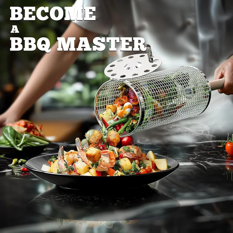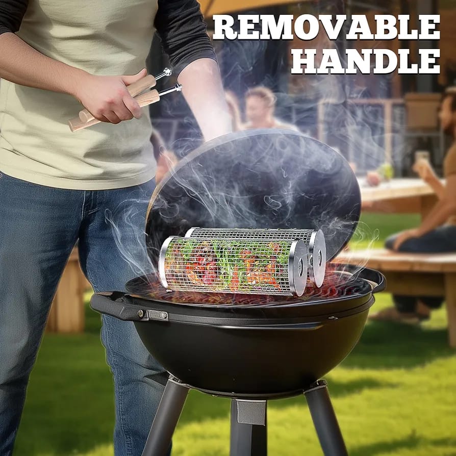 ‎Rolling Grill Basket, Removable Wooden Handle, 304 Stainless Steel, Nesting Grilling Net, BBQ Accessories Tools for Vegetables Shrimp, Outdoor Cooking Camping, Birthday Gifts for Men Dad Husband