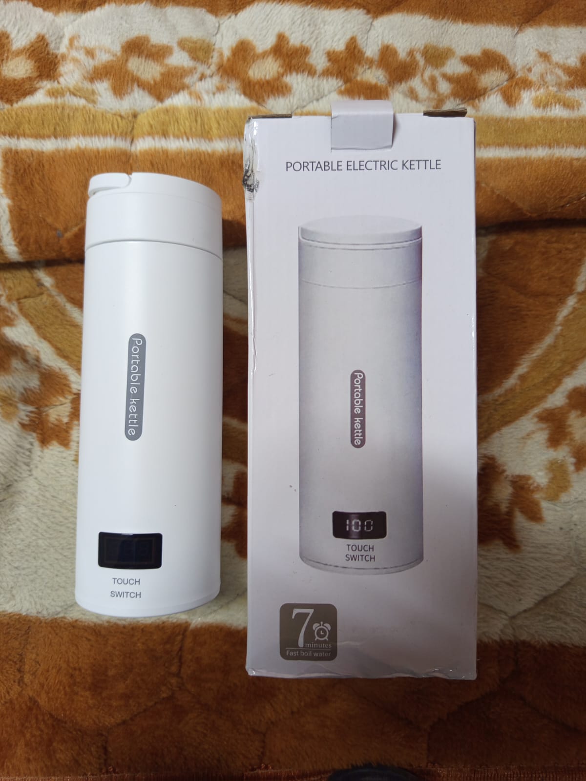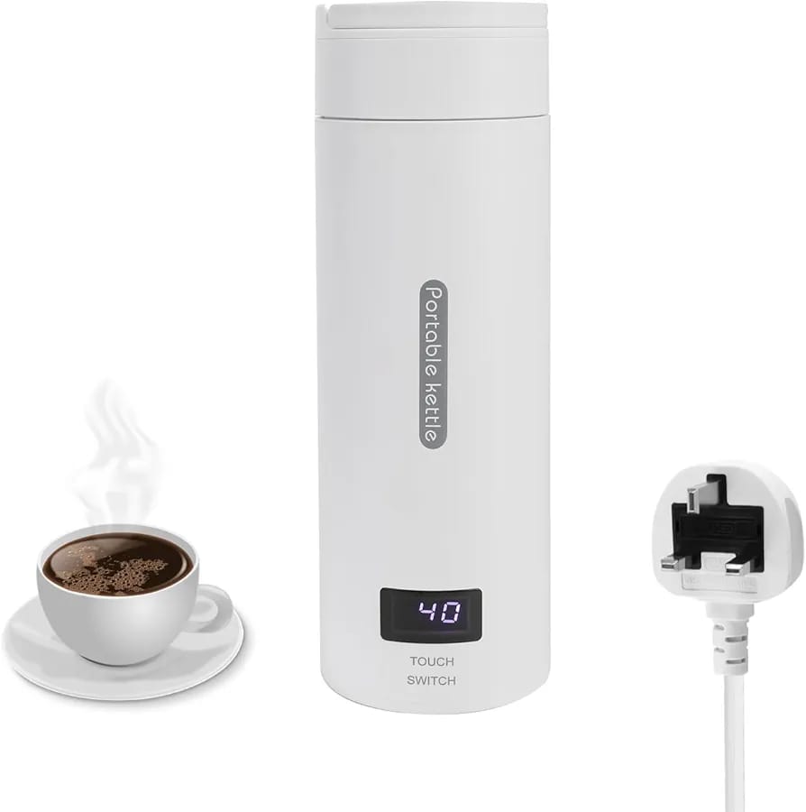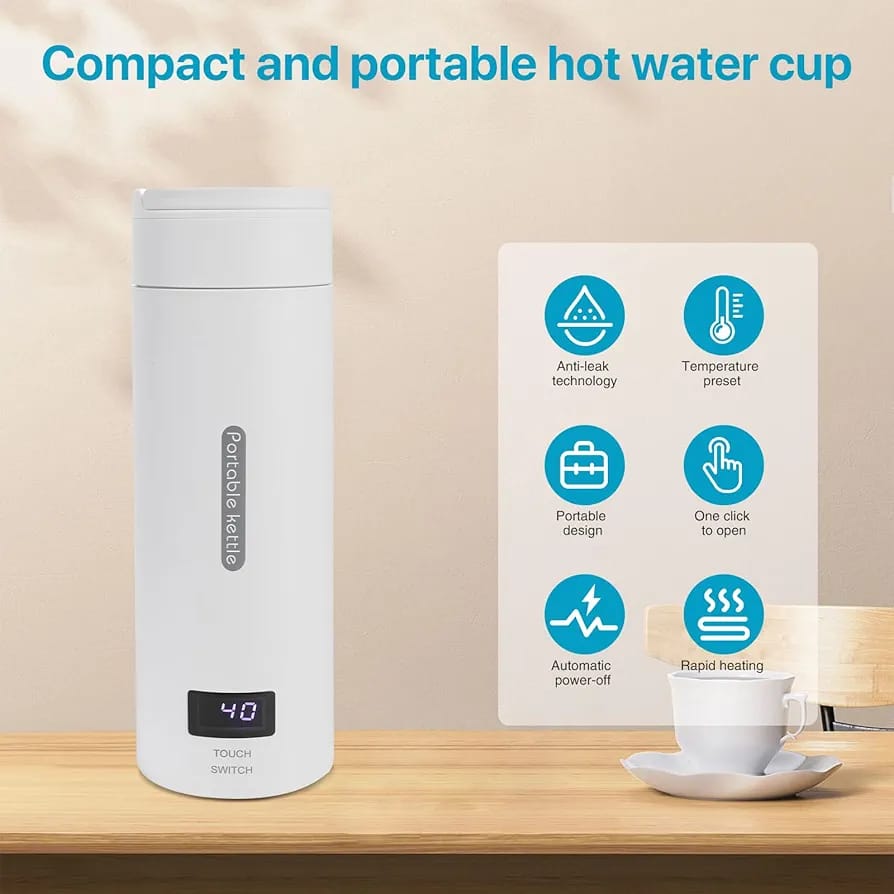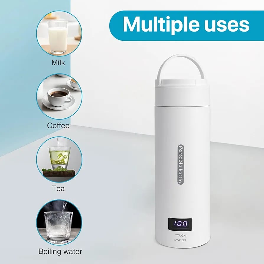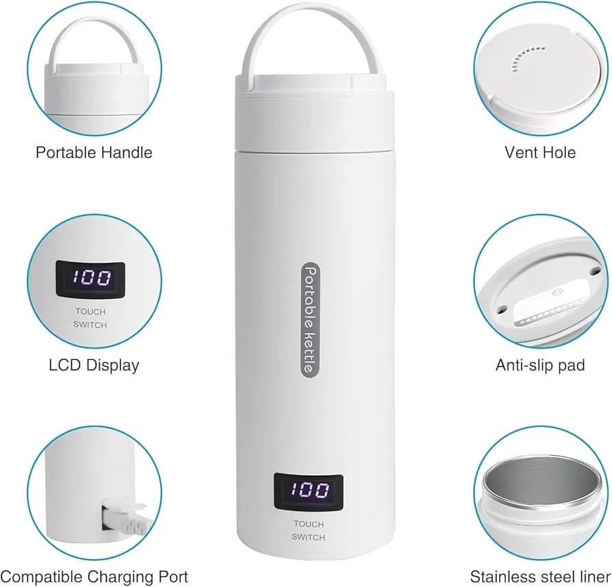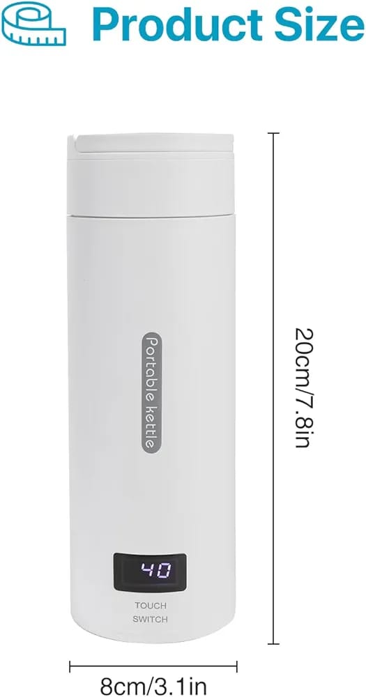 Portable Carrying Handle, Ready for Your Trip==This Portable Kettle with Temperature Control sized 20.5*7.5 cm, weighted 500g. Portable Heating Cup Exquisite, small size and light weight, portable water boiler can be carried around. Small and portable hot water kettle, not only be used as Electric Kettle, but also vacuum cup. Travel water kettle has a great seal so it won’t leak even upside down turn, you can safely put the water heater kettle in your suitcase or backpack.