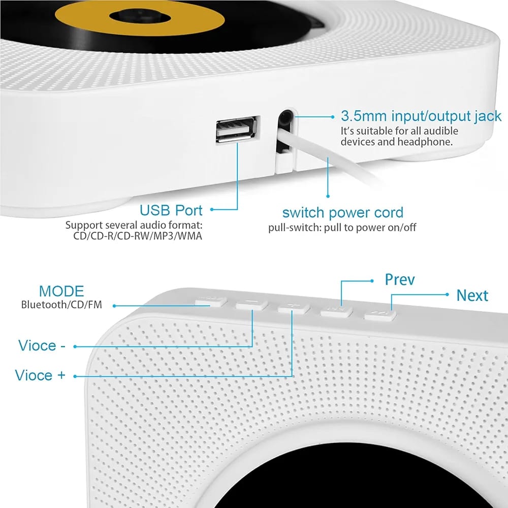 Multifunctional CD Player:It can be used as a Portable CD Player, Bluetooth HIFI Speaker, FM Radio, Mini Home Boombox Music Player, USB Flash Drive Player, Audio Player, Alarm Clock.